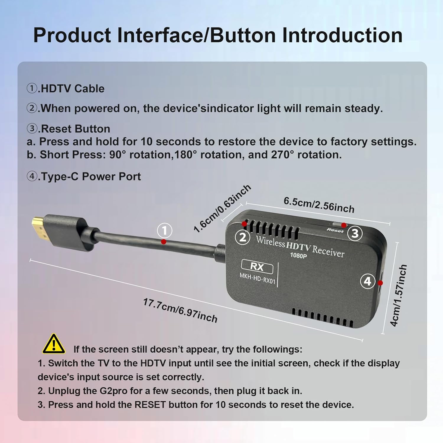 If the screen still doesn’t appear, try the followings: 1. Switch the TV to the HDTV input until see the initial screen, check if the display device’s input source is set correctly. 2. Unplug the G2-pro Adapter for a few seconds, then plug it back by 5V1A power in later. 3. Press and hold the RESET button for 10 seconds to reset the G2-pro Adapter.