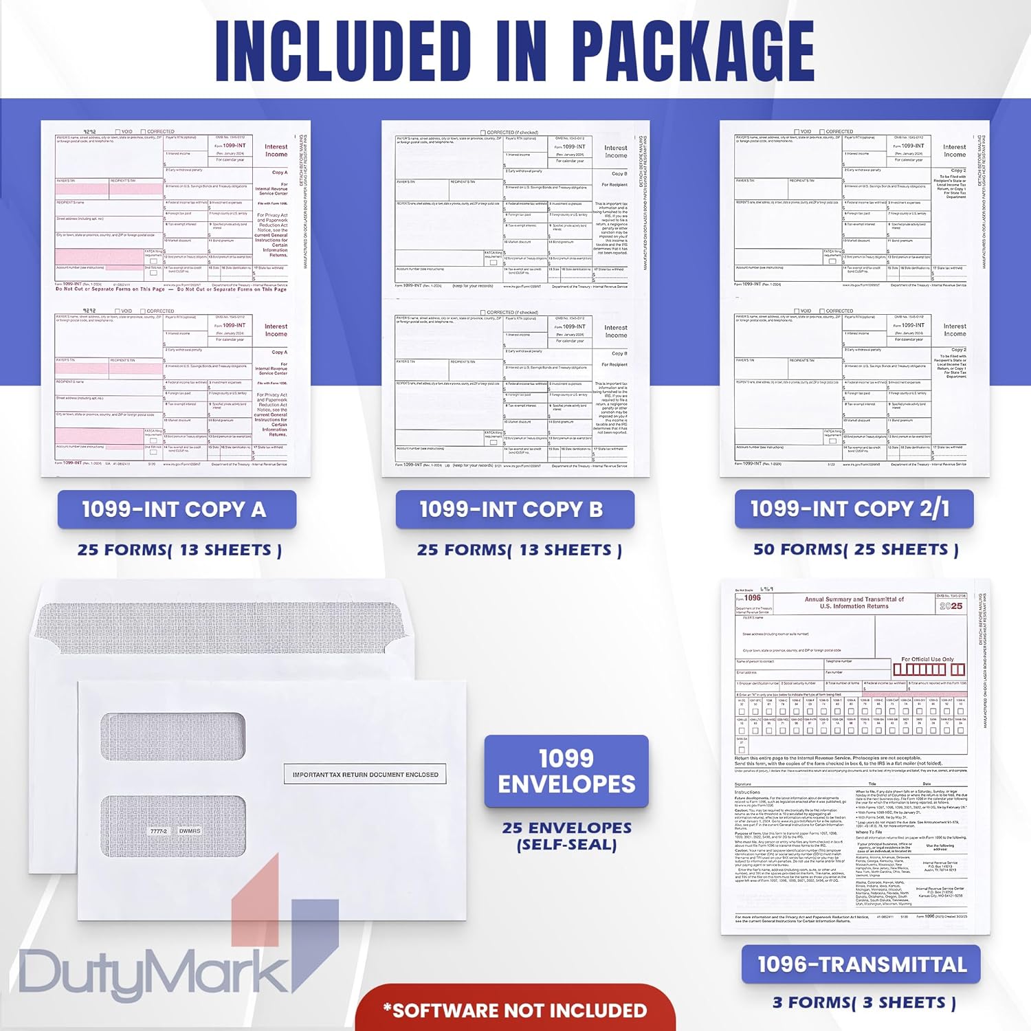 Tax Set Includes: Federal Copy A, Recipient Copy B, Payer and/or State Copy C and 1096 and 25 Compatible Self-Seal Confidential Envelopes. Software not inluded
