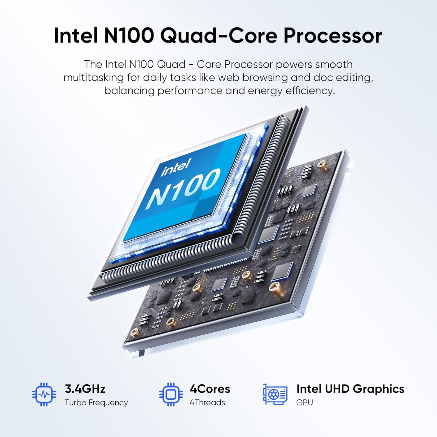 ✔ N100 Quad-Core Efficiency: Powered by the energy-efficient N100 processor (up to 3.4GHz), this device delivers smooth performance for daily productivity, video streaming, and light creative work. The quad-core architecture balances power and battery life for all-day usability.