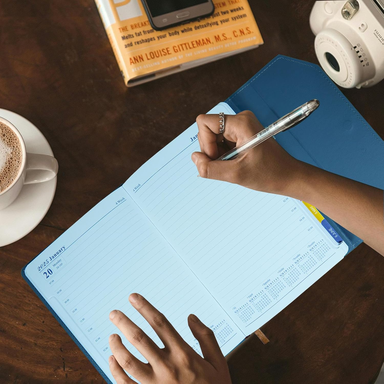 Functional details: This planner features a minimalist and refreshing design, with a high-quality faux leather cover and a built-in pen loop for easy storage and access to your pens. The inclusion of a metal magnetic closure not only enhances functionality but also adds a sophisticated flair. Its elegant design makes it a joy to carry and use, keeping your pens organized and secure, thus preventing loss