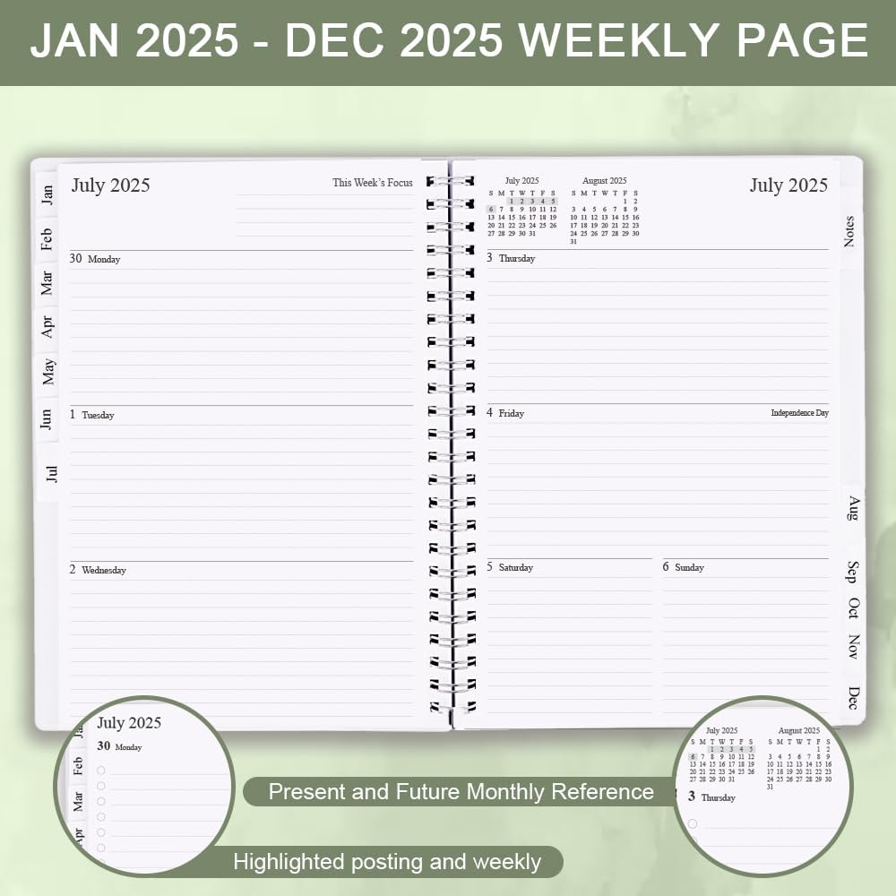 PLANNER OVERVIEW – 12 Months planner 2025 runs from January 2025 – December 2025, featuring 12 months of monthly and weekly pages for easy planning. 6.25″ x 8.25″, comfortable to carry and use