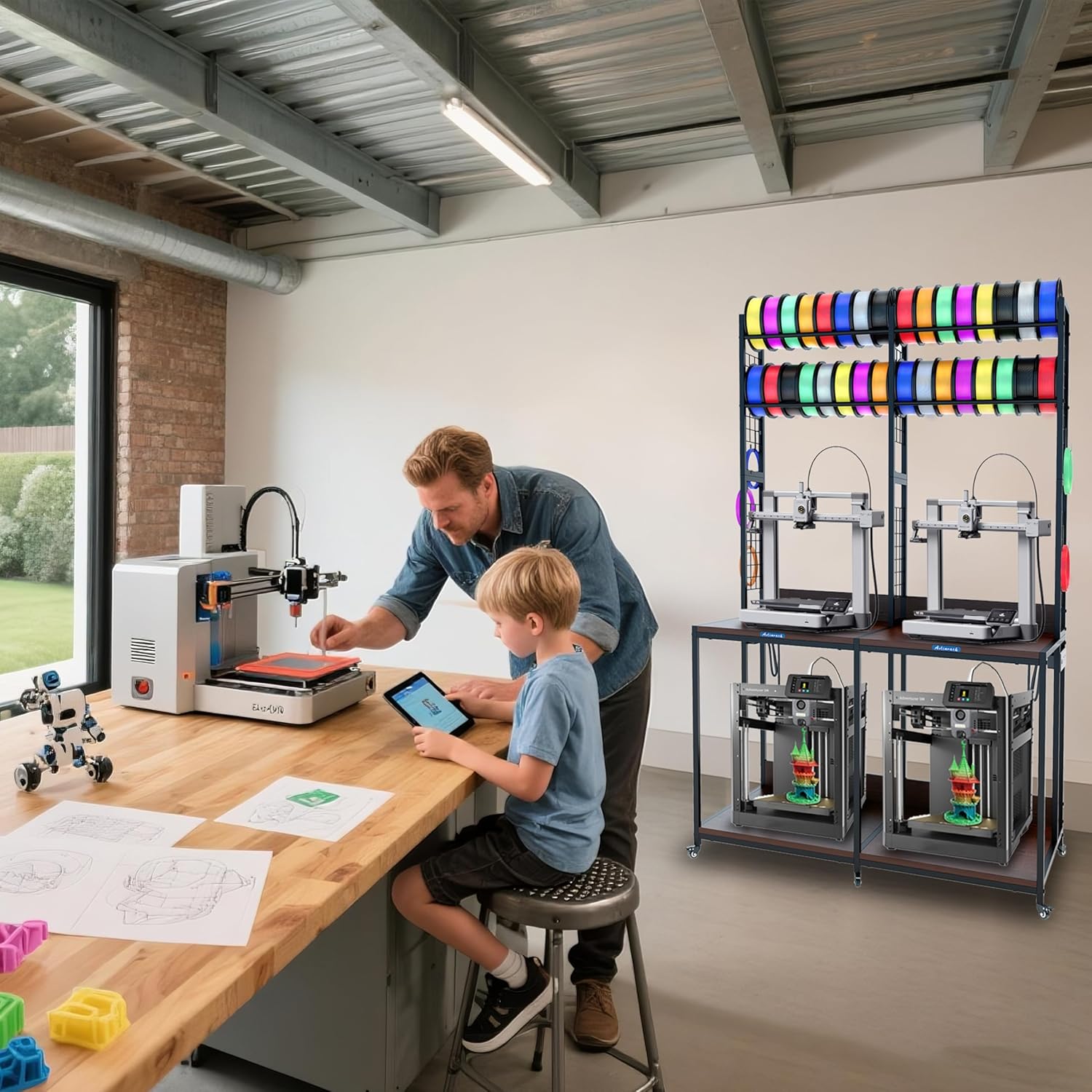 Enjoy a Larger, More Organized Work Surface: This 47″W x 24″D storage rack offers ample space and smart organization. Its dual-station design allows you to move your 3D printer off your desk for easier access, freeing up your workspace and keeping things neat. Thoughtfully sized to hold printers, filament, tools, and supplies, it fits perfectly into studios, offices, living rooms, garages, or any busy area—helping you create a more productive and enjoyable environment.