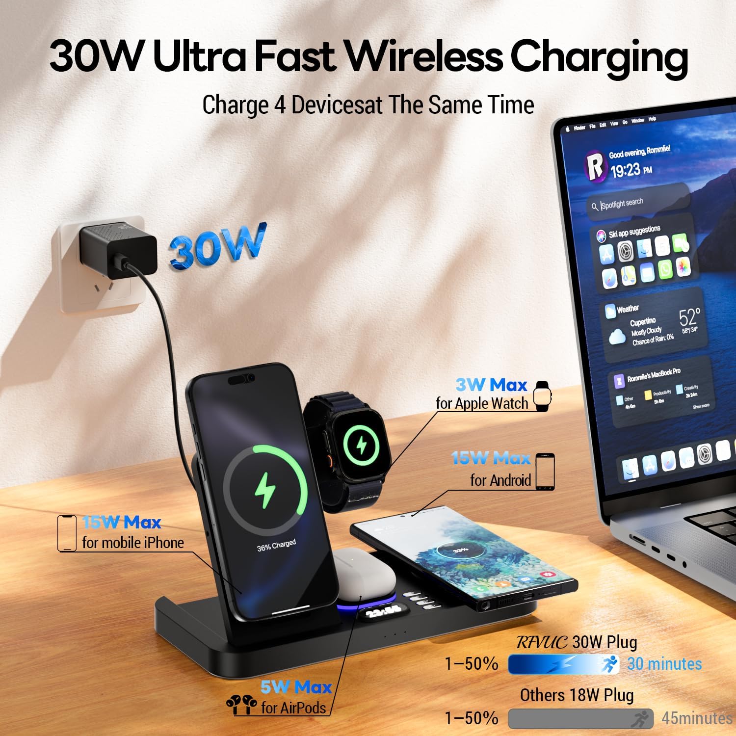 【30W Ultra-Fast Charging】: For optimal and safe charging, use the included 30W Quick Charger 3.0 (9V – 3A) power adapter and charging cable. This ensures a full charge in about 2 hours. The station provides charging outputs of up to 15W for phones, 5W for earbuds, and 3W for watches.