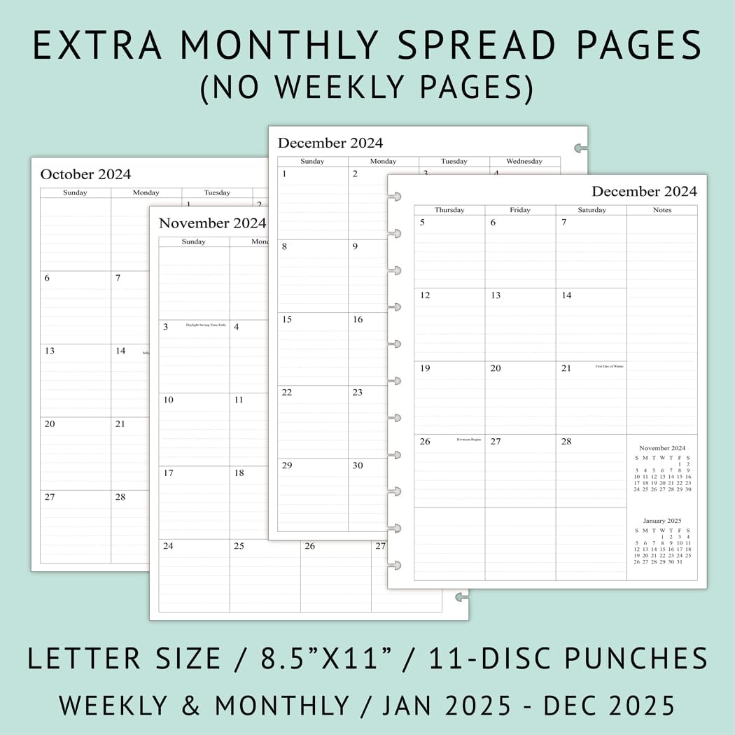 2025 weekly paper for letter sized discbound planners, features monthly tabs, white and thick fountain pen friendly paper, 11-disc punches.