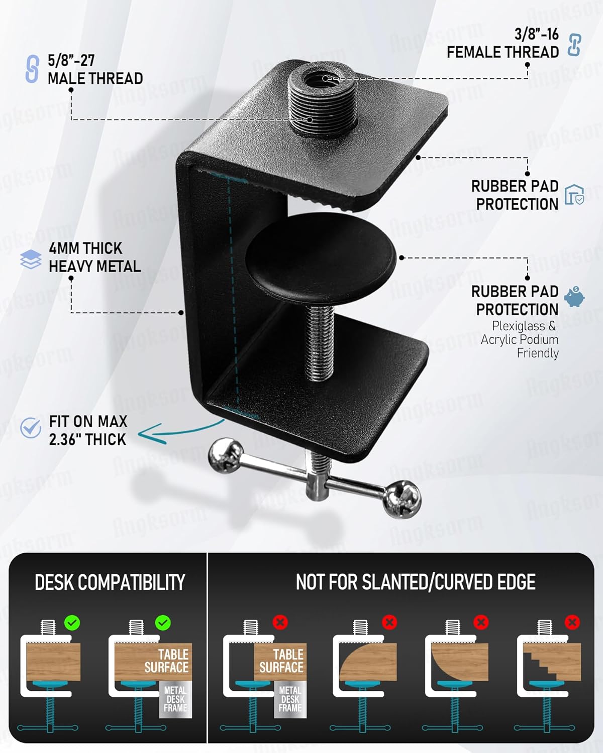 DOUBLE RUBBER PAD PROTECTION – These fantastic and extremely low-profile flat-surface clamps are perfect for attaching to podiums, tables, desks, and piano bars. They fit surfaces up to 60 mm (2.36 inches) thick. The brace and screw-in mount are both padded to prevent scratches or imprints on the desk material. They effectively cancel out sharp noises and reduce vibrations. (This c-bracket is especially friendly to plexiglass and acrylic lecterns, and will not be subject to any scratches.)