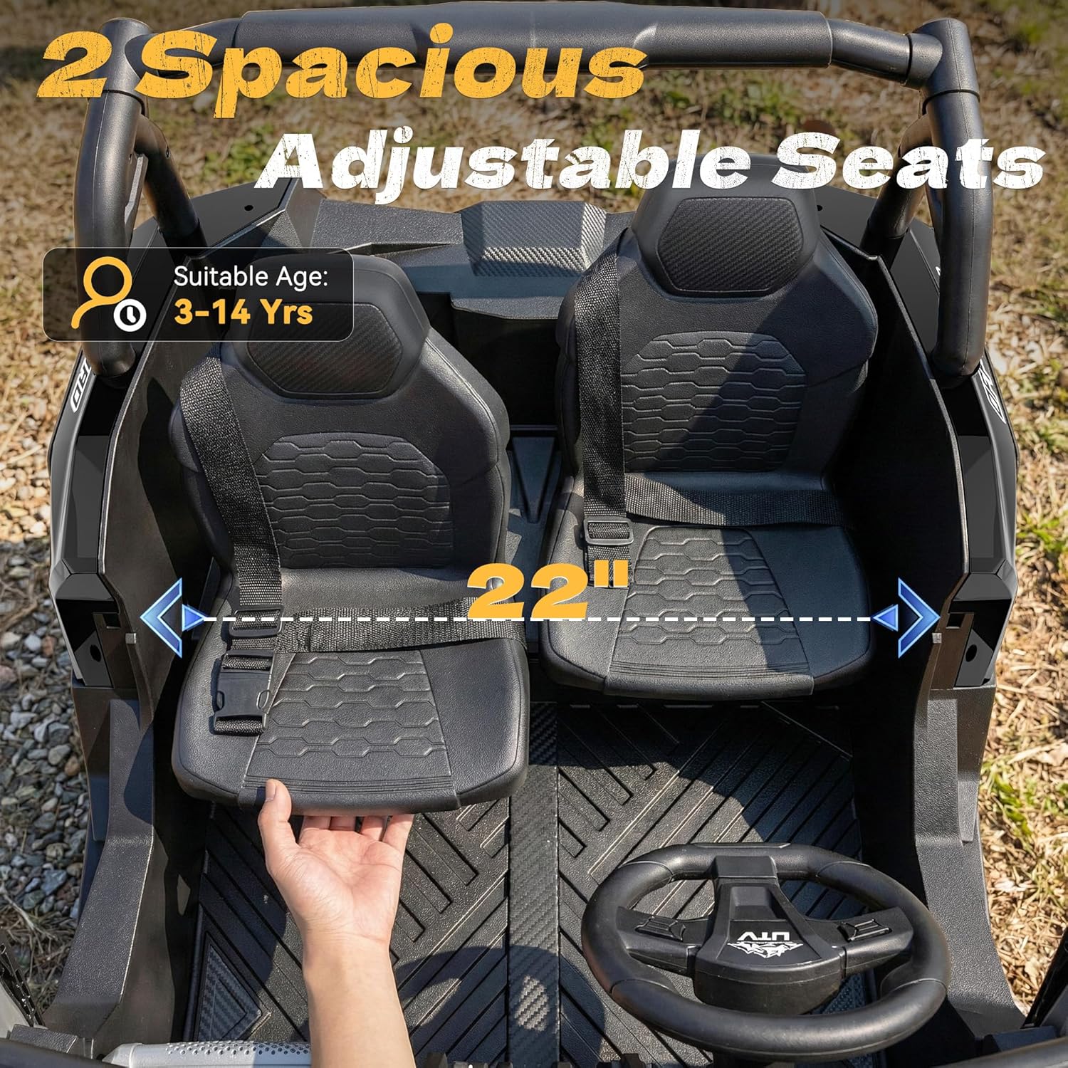 Extra-Wide 22″ Seating & 220 lb Payload: Say goodbye to cramped, fixed seating. This kids ride on toys features 2 independently adjustable seats with a combined width of 22 inches, designed to grow with your child from ages 3 to 14. It can comfortably seat two young children side by side, or provide ample legroom for a single older child or teenager. With a strong 220 lb weight capacity, its robust frame can even support an adult; perfect for siblings, friends or family to share the adventure