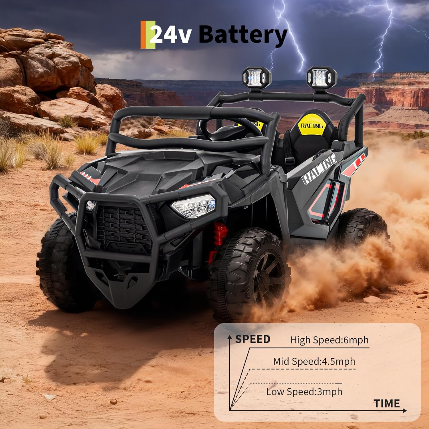 【24V Strong Performance】:Powered by a 24V system and a high-efficiency motor, this ride-on truck handles grass, sand, gravel, and gentle slopes with ease. It offers three speed levels up to 6 mph, provides 1–2 hours of run time per charge, and requires 8–10 hours for a full charge—delivering reliable off-road excitement.