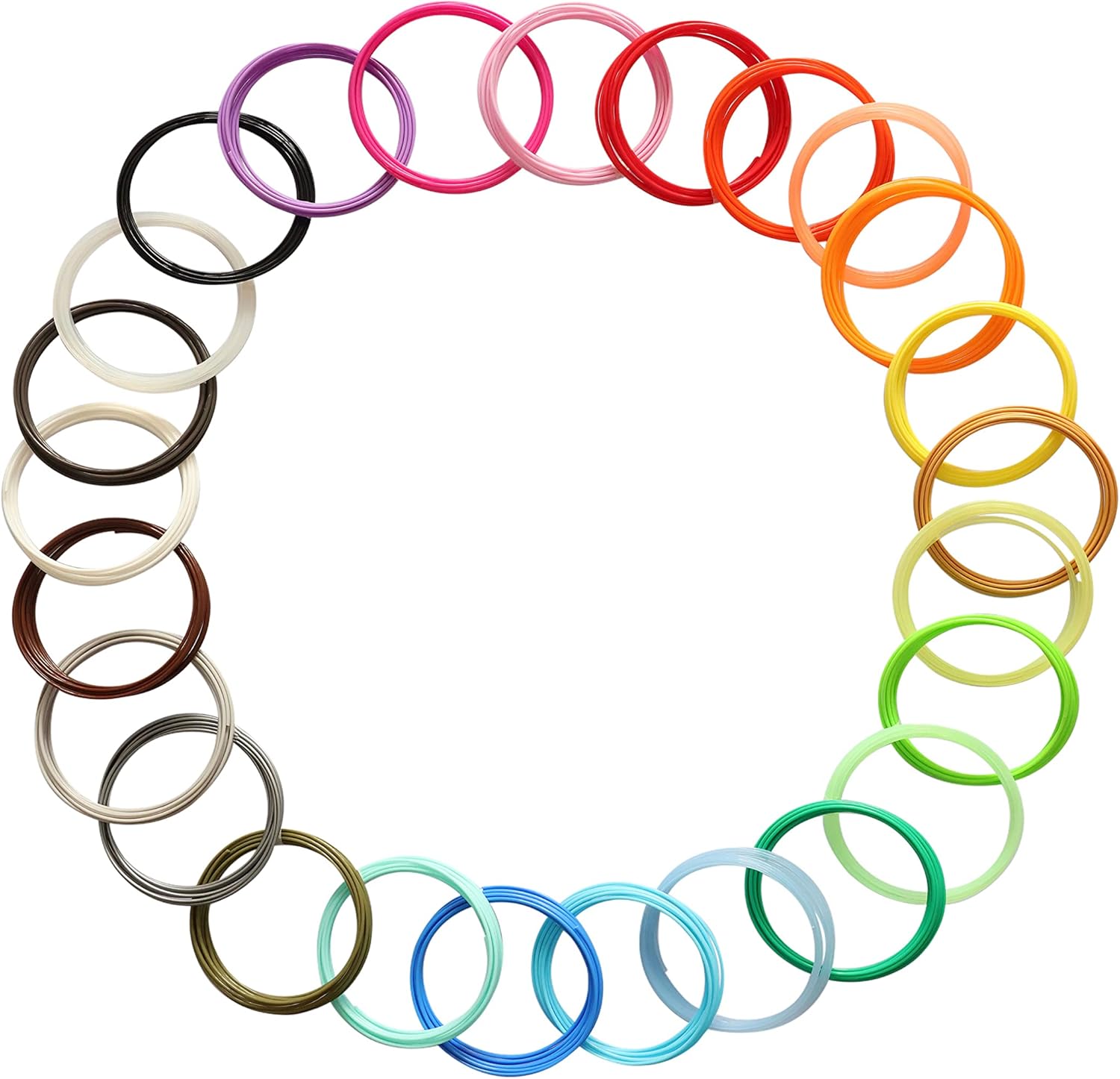 Bright Most Popular 25 Colors Mixed: Gold, Brown, Silver, Dark Grey, Light Grey, Green, Clear Lime Green, Lime Green, Cyan, Clear Light Blue, Bright Blue, Sapphire Blue, Pink, Clear Orange, Rose Gold, White, Red, Yellow, Orange, Clear Yellow, Black, Army Green, Purple, Selom Orange, Clear. Great Sample Pack for 3D Printing Pen / 3D Printer