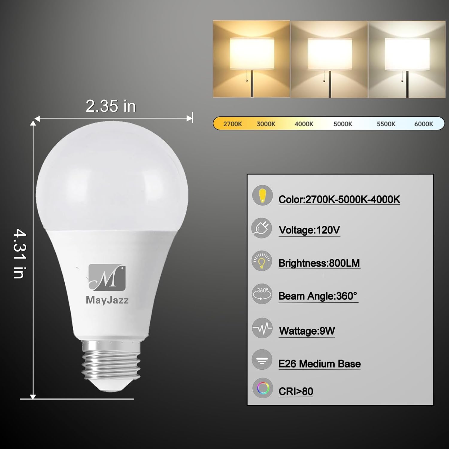 【3 Color Temperature Light Bulb】Compared with traditional light bulbs that use dials to adjust color temperature, this light bulb is more smart. After installing the bulb, change the three different color temperatures (warm white- daylight-natural) by turning on/off the switch. The 3-color bulb has a wider application range and is more convenient.