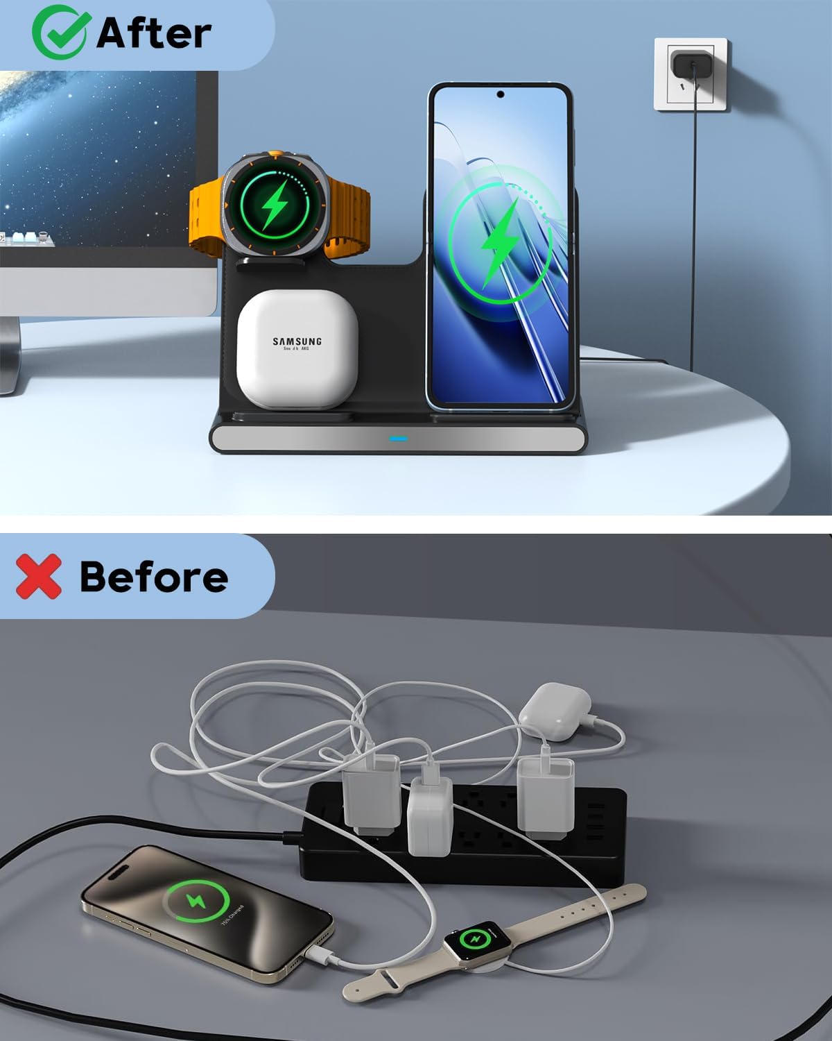 Designed exclusively for Samsung users:This 3-in-1 wireless charger delivers seamless charging for your entire Galaxy ecosystem.It supports Galaxy phones (S25/S24/S23/S22/S21/S20/Note20/10/Z Fold/Z Flip series),Galaxy Watch (Watch 8/7/6/5/4/3/Active2),and Galaxy Buds (with wireless charging case).The stand features an additional built-in Type-C port for wired charging.*Note:Not compatible with Galaxy Gear S3/S2/Sport,Apple Watch,or older Galaxy Watch 42mm/46mm (2018).*