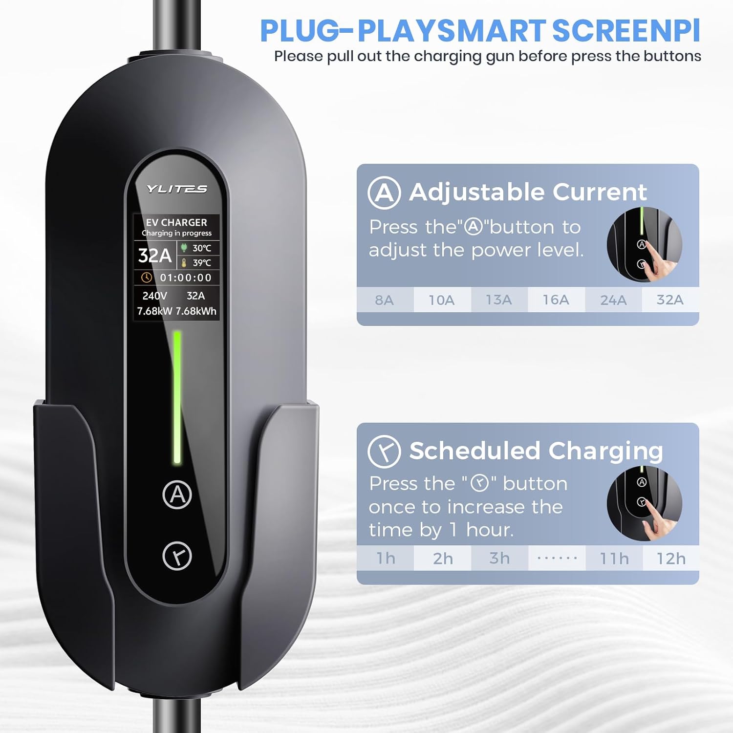[User-Friendly Display] YLITES ev charger features a convenient built-in display, This screen lets you easily monitor the charging status and current settings at a glance, without having to rely on limited vehicle information or complex apps. Whether you’re at home or on the go, you can always stay informed and in control of your charging experience—simple, clear, and user-friendly.
