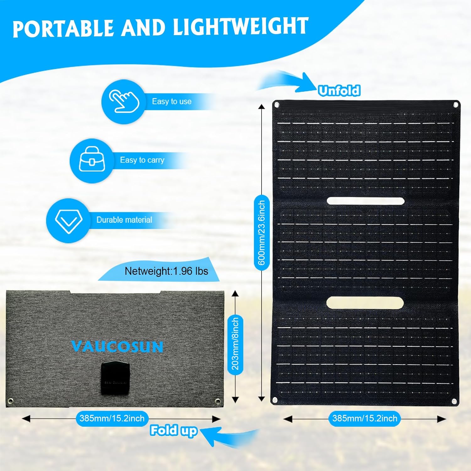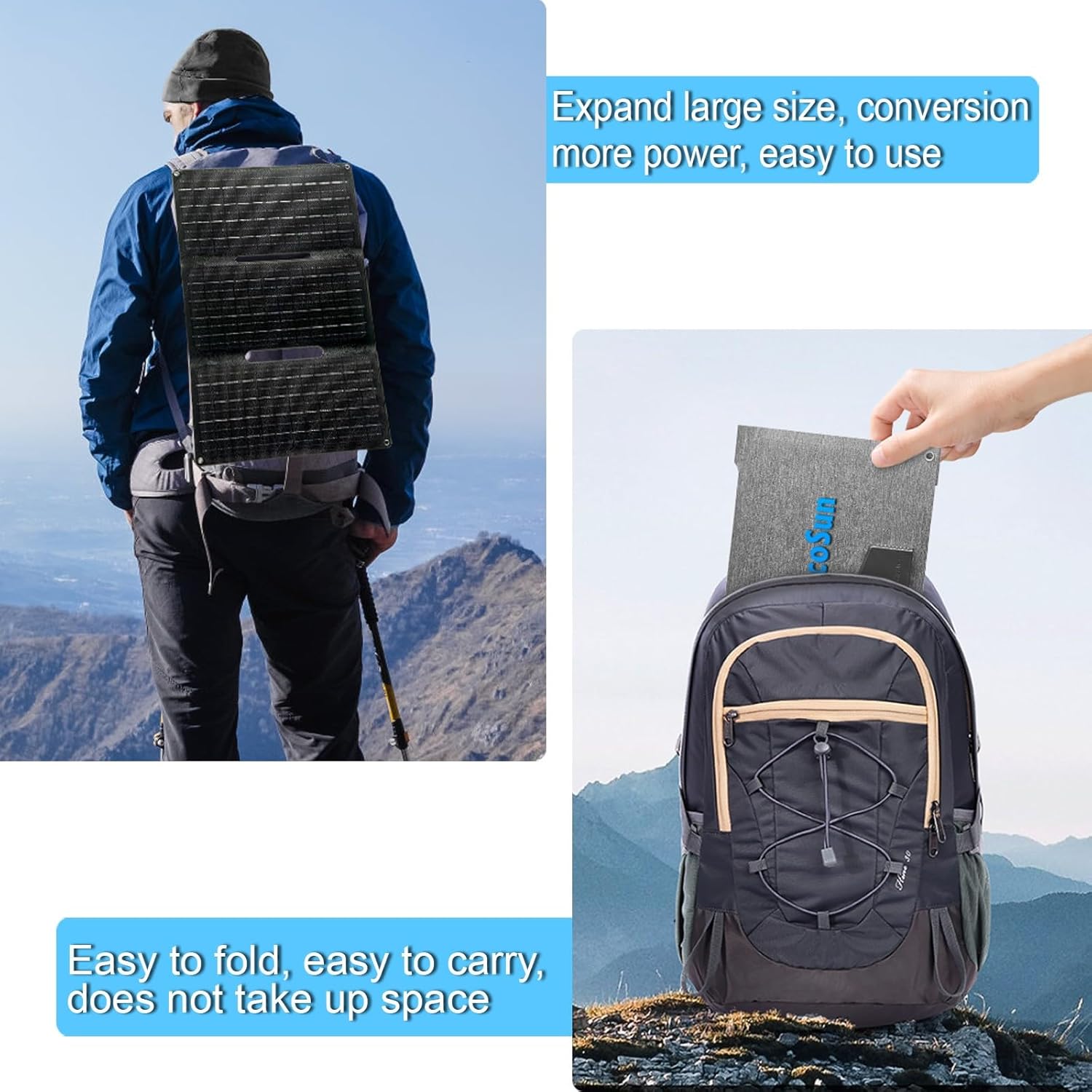 【Portable Carry】Compact size (15.2 × 8 × 1.4 inches when folded) and lightweight (1.96 lbs only panel) design, portable and light enough to fit into any camping backpack or hiking backpack. It’s also a must-have to keep in your emergency kit.