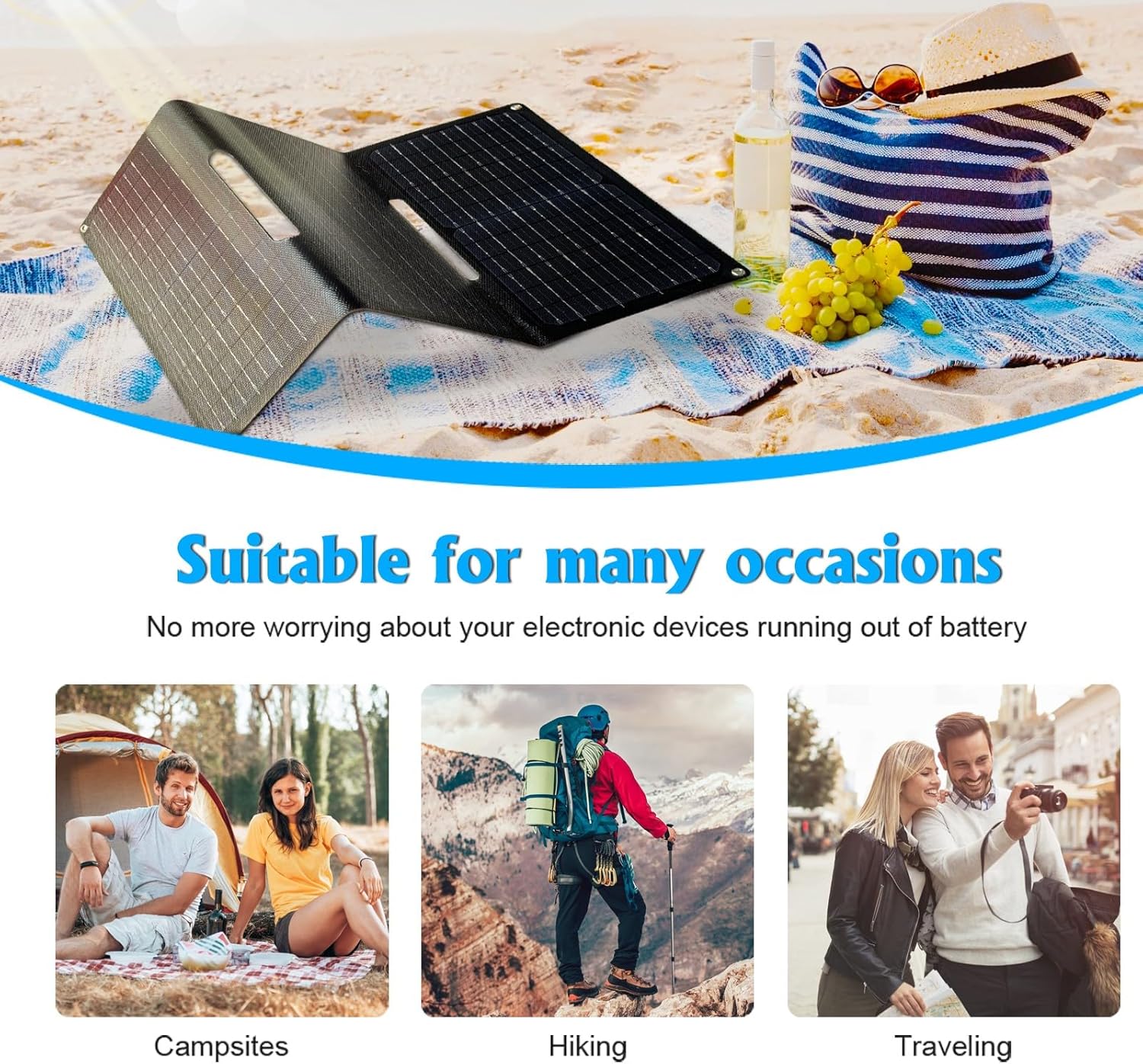 1, Compact enough to easily transport and powerful enough to charge most devices. Ideal for camping, backpacking, hiking, outdoor adventures and is essential in any disaster, emergency, and hurricane prep kit for survival. This panel can charge a wide range of electronic devices, including devices such as power stations that accept DC, as well as any USB device including your iPhone, Samsung, Pixel, iPad, laptops, power banks and more. An excellent solar charger for cell phone. Never be caught without power.