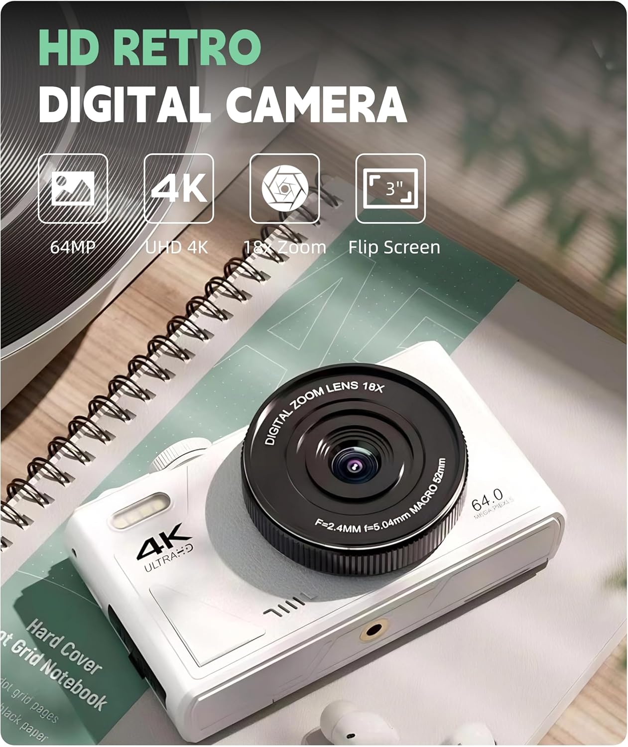 64MP and UHD 4K: This camera features a 64MP high resolution sensor, capable of capturing detailed images rich in color and contrast. With a flip out 3 inch screen and 4K video resolution, you can smoothly shoot stable HD videos.