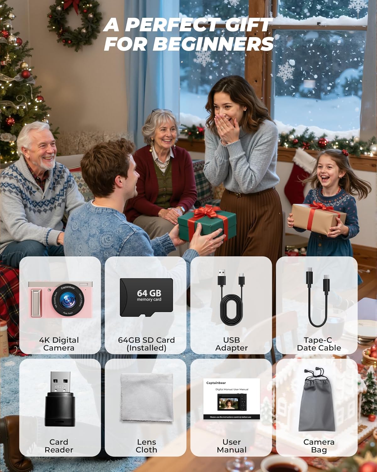 【Long Battery Life & Ample Storage】Equipped with a 1500mAh rechargeable battery and a 64GB SD card, this cameras for photography supports long shooting sessions without interruptions. You can store up to 8,500 photos or record about 4 hours of 4K video, making it perfect for travel, events, and vlogs. The powerful battery lets you shoot all day without worrying about power or memory.The small digital cameras come with an installed 64G SD card, so you can use it right away.