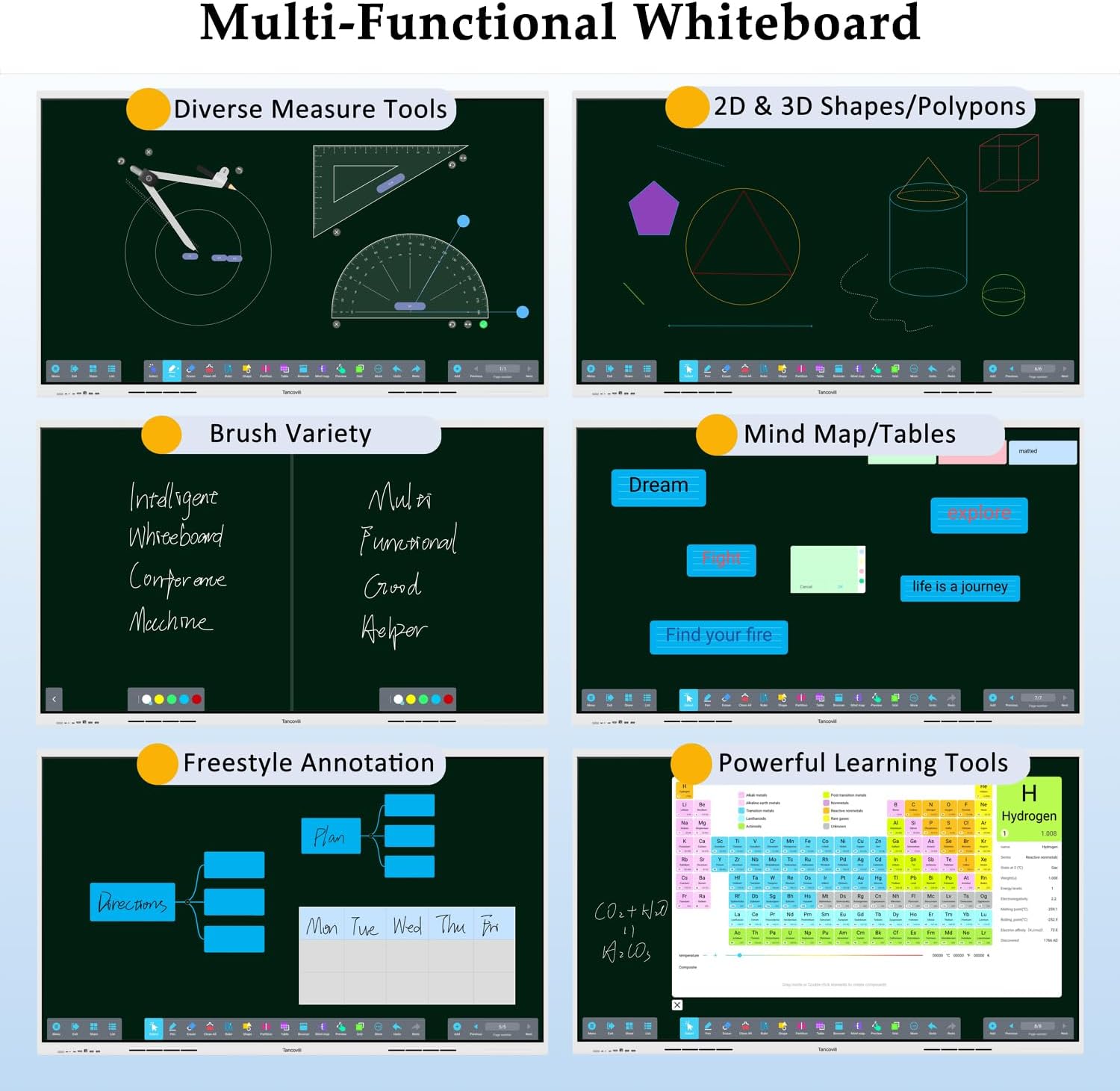 Equipped with Smart Whiteboard Software – 40-point touch control, supports simultaneous multi-user writing, 5-millisecond writing latency, multiple writing modes available, gesture erase, OCR text AI auto-recognition, built-in mind map, diverse teaching tools, 3D math models, and other auxiliary tools. Features infinite page roaming, with discussion results savable to email or mobile via QR code scanning.