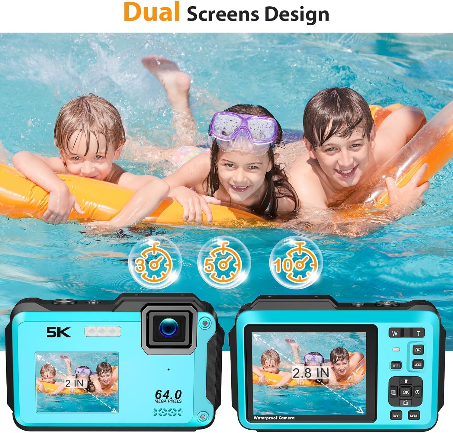 3" / 8 cm 📷【5K 64MP UHD Underwater Camera】Muraux waterproof digital camera is fully equipped with upgraded 5K video and 64 MP of image resolution, from vibrant snorkeling escapades to serene underwater cruising, it delivers stunning imagery with every shot. With 16X digital zoom and integrated fill light, ensure your underwater adventures are captured with exceptional detail and clarity. 🤳【Advanced Dual-screen Selfie Design】Effortless selfie capture with Muraux waterproof camera’s advanced dual-screen design. Single long-press the “DISP” button to switch between regular and selfie mode using the 2.8″ front and 2″ rear screens. With built-in self-timer options (2s, 5s, 10s, and 20s), perfect selfies and group shots are a breeze. never miss any wonderful moment of your underwater adventure. 🏊【16FT Waterproof Camera】Diving in underwater exploration with Musaux waterproof camera, boasting an impressive waterproof rating of up to 16ft (5m). With its durable design and reliable waterproofing, you can capture stunning moments beneath the surface, just make sure the battery door is securely locked before taking the plunge every time. 🌊【Versatile Features and Easy Use】Muraux underwater camera offers video mode, a built-in microphone for stable recording, and functions as a webcam for video calls and live streaming. It comes with a USB cable and a 32GB TF card for easy transfer to your computer. Plus, The robust 1200mAh rechargeable battery ensures enduring power for extended adventures. 🎁【Perfect Gift for Kids】This Muraux underwater camera features a stylish design, crafted with a pocket-size compact design, weighing only 0.85lb, perfect for kids and teens to carry effortlessly anywhere they go. Making it an ideal birthday or Christmas gift for both boys and girls. The drawstring bag is for storing while traveling, especially during underwater use. To enhance your experience further, our 24/7 after-sales service is available to assist whenever needed. 🔋【Battery Installation】To prevent battery leakage in transit, the battery isn’t pre-installed. Please align the 3 contact bars at the bottom with the “up” sticker facing to the right, firmly push it in until you hear a slight clicking sound, then close the cover and push up to lock it.