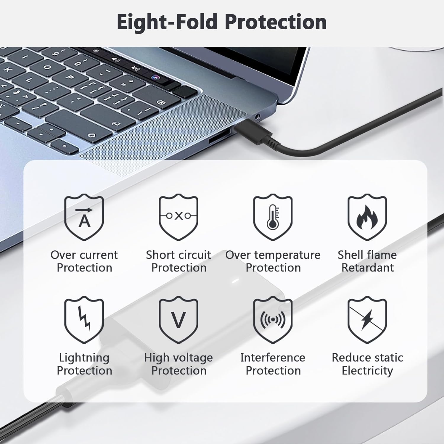 Enhanced Protection: Our smart chip technology ensures comprehensive protection for your device, including overcurrent, short circuit, overtemperature, and high voltage protection. The charger is also equipped with shell flame retardant, lightning protection, interference protection, and static electricity reduction features for added safety and reliability
