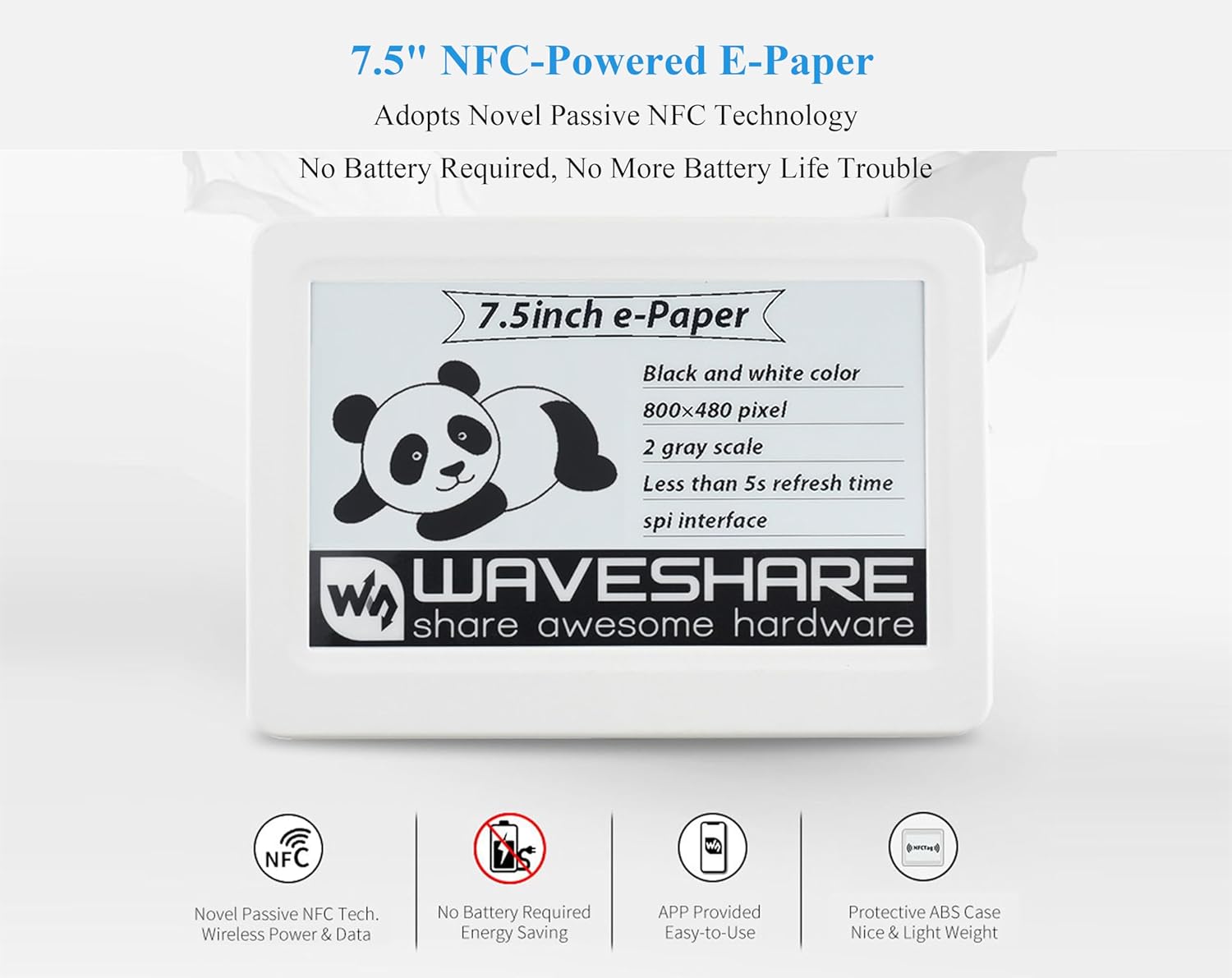 7.5inch Passive NFC-Powered e-Paper— This is an NFC-powered 7.5inch e-Paper Module, with 800×480 resolution, Adopts novel passive NFC technology.No battery required, no more battery life trouble