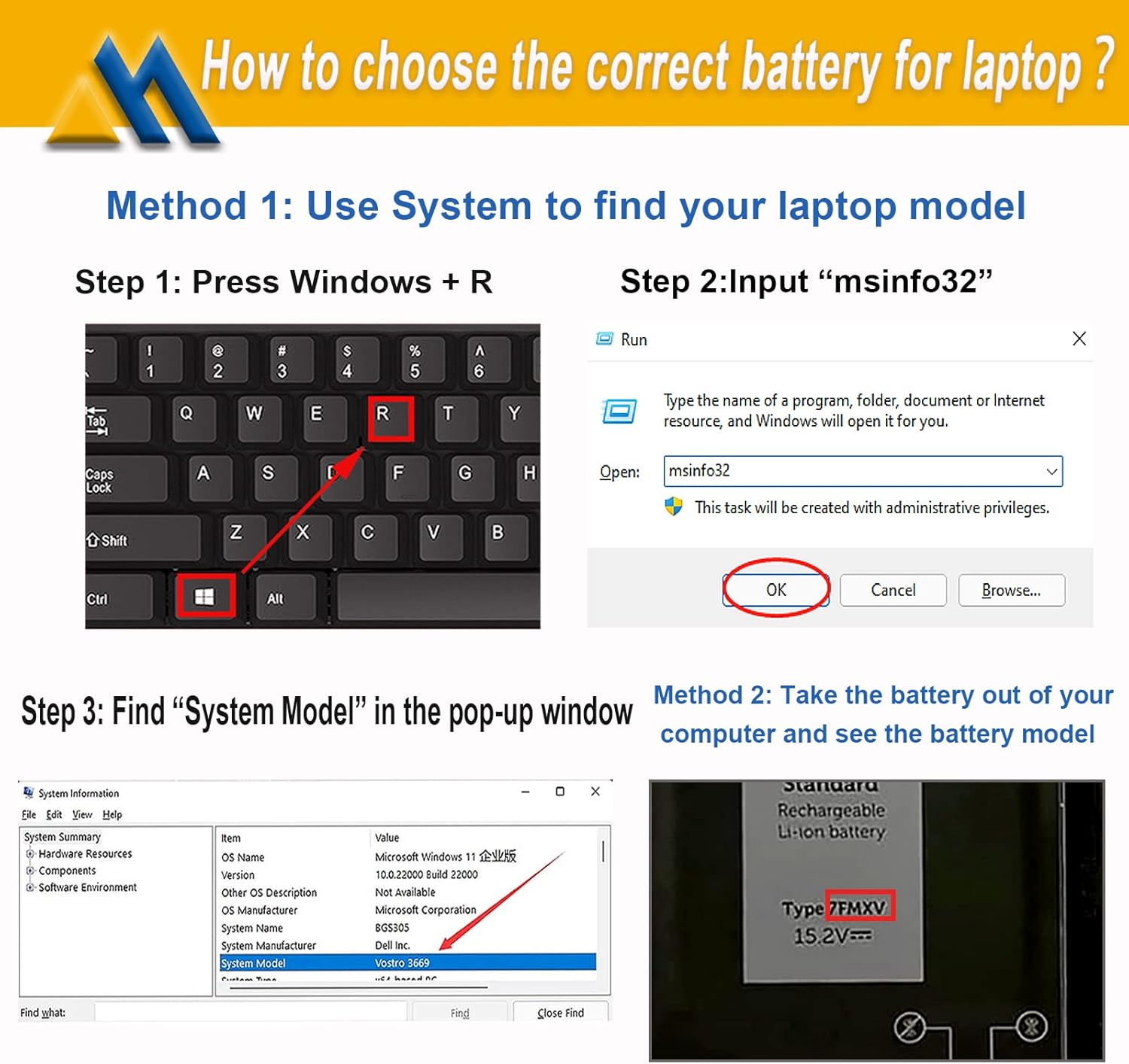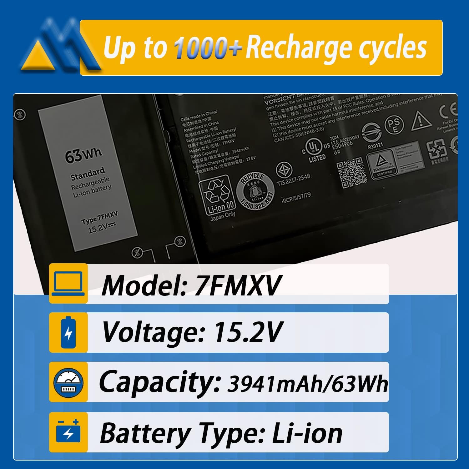 【Tech Specs & 100% New Products】Model: 7FMXV Voltage: 15.2V Capacity: 63Wh/ 3941mAh 4-cell Battery type: Li-ion (We only use grade A battery cells that provide up to 500 recharge cycles over the life of the battery. Come with screwdrivers.)