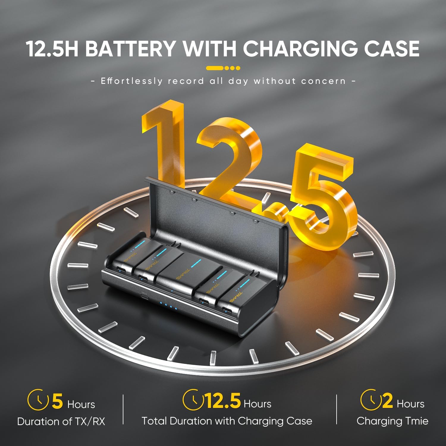 5 hours of operation on a full charge. With its compact charging case, you can recharge the entire set 1.5 times, with each full charge taking only 2 hours. This means that with the charging case, you can enjoy a total battery life of 12.5 hours. No more worrying about low battery situations