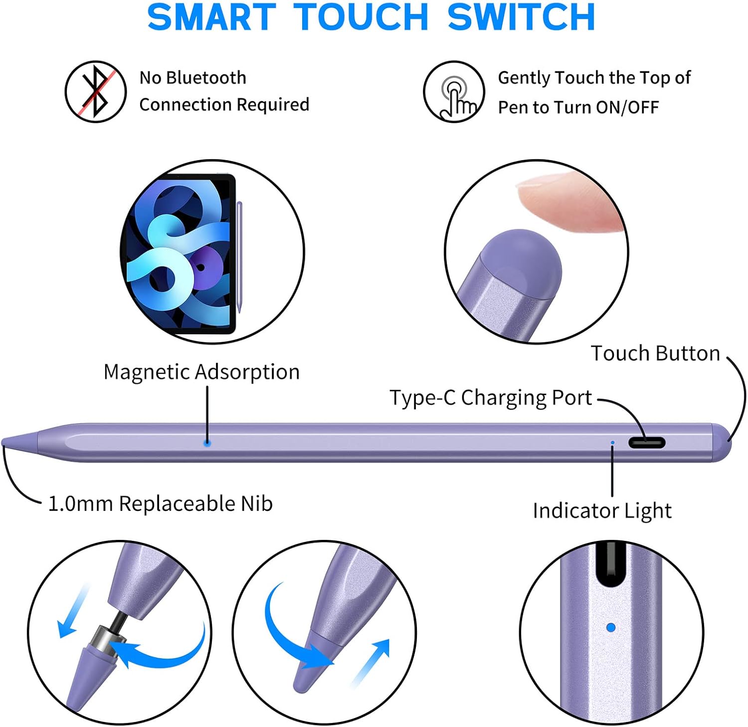 TOUCH ACTIVATED AND EXTRA LONG STANDBY — Easily turn on/off by touching the top of the digital pen. No Need to Install Bluetooth or Apps. Regardless of whether it’s in use, it will automatically turn off after 5 minutes to ensure energy savings, safety and keep long life. 20 hours continuous working. 365 days long-lasting standby time for about 60 minutes per charging by Type-C cable (Included) via AC adapter, power bank, or computer
