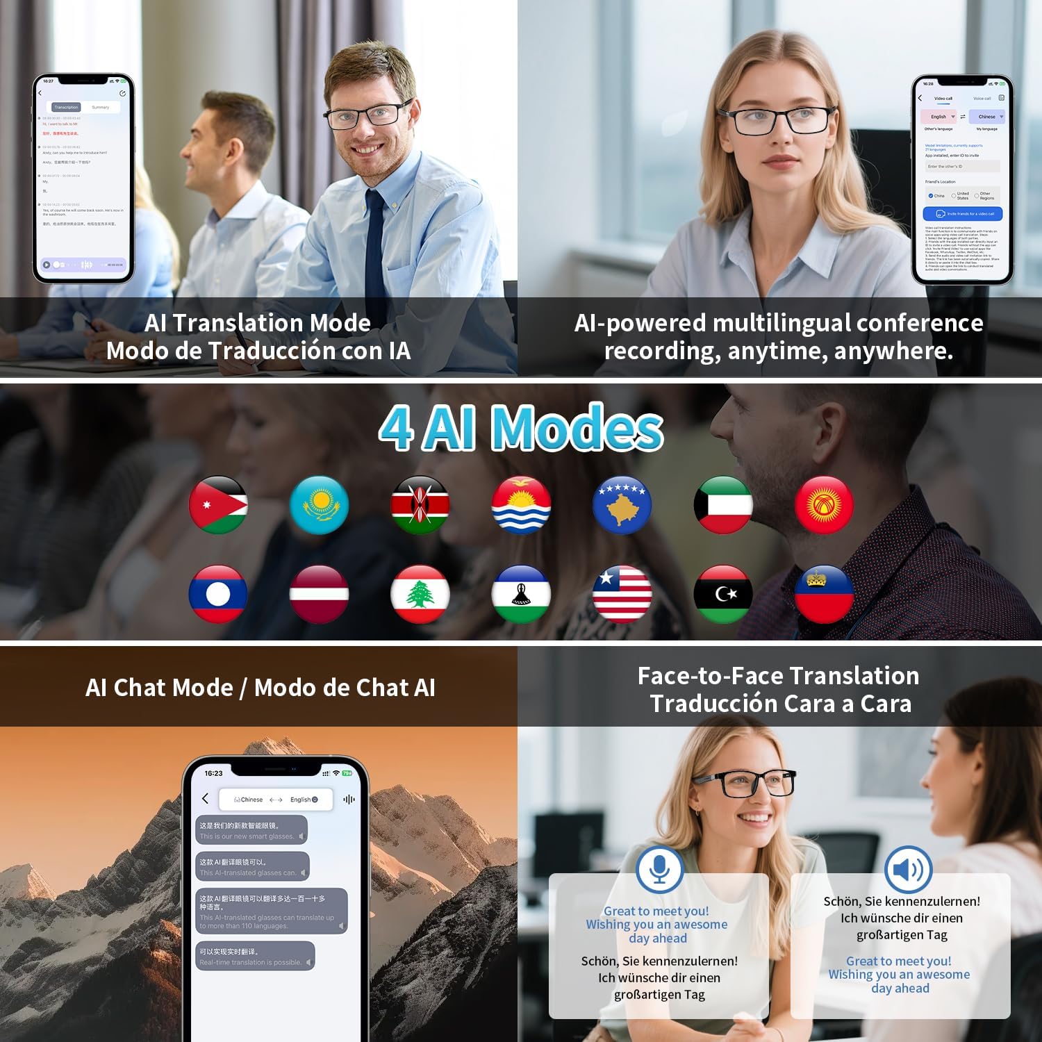 Multi-functional AI Translation Glasses ▶ These AI Translator glasses Powered by ChatGPT provide a seamless communication solution for international travel, business collaboration and cross-cultural exchanges through real-time face-to-face translation in over 160+ languages, simultaneous interpretation and audio/video call language switching capabilities for free cross-language dialogue in multiple scenarios.