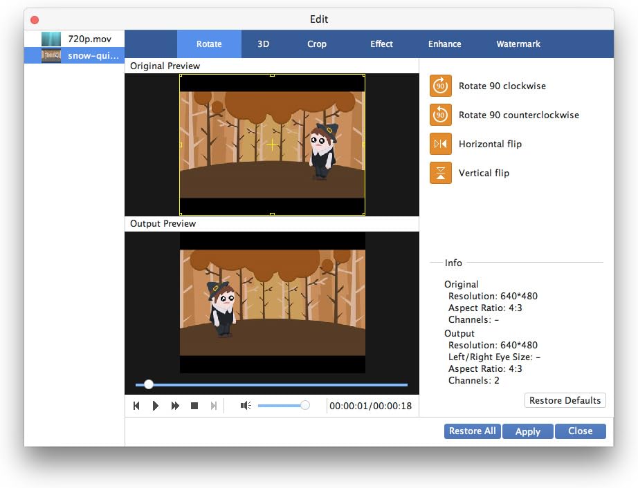 3. This video converter also enables you to edit video effects. You could clip video into parts and merge clips into one long film. Also, you could turn 2D to 3D for a VR experience with your VR device. Rotating or flip video can make you watch video to suit your vision. Cropping video to get rid of black edges, and effects-adjustment will enable you to set video and audio effects manually. Watermarking will customize your video for YouTube.