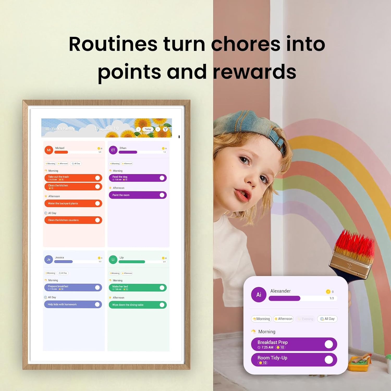 Reward-Based Chore Chart, Routine & Meal Planner — Turn chores into fun while keeping the whole family organized. This electronic calendar lets kids earn rewards for completing daily tasks and helps build healthy routines. Create color-coded to-do lists for groceries, shopping, wish lists, and plan weekly meals to stay on top of family dining — all in one place via the Apolosign Calendar Mobile App (Currently available only in the U.S., Canada, and the U.K.)