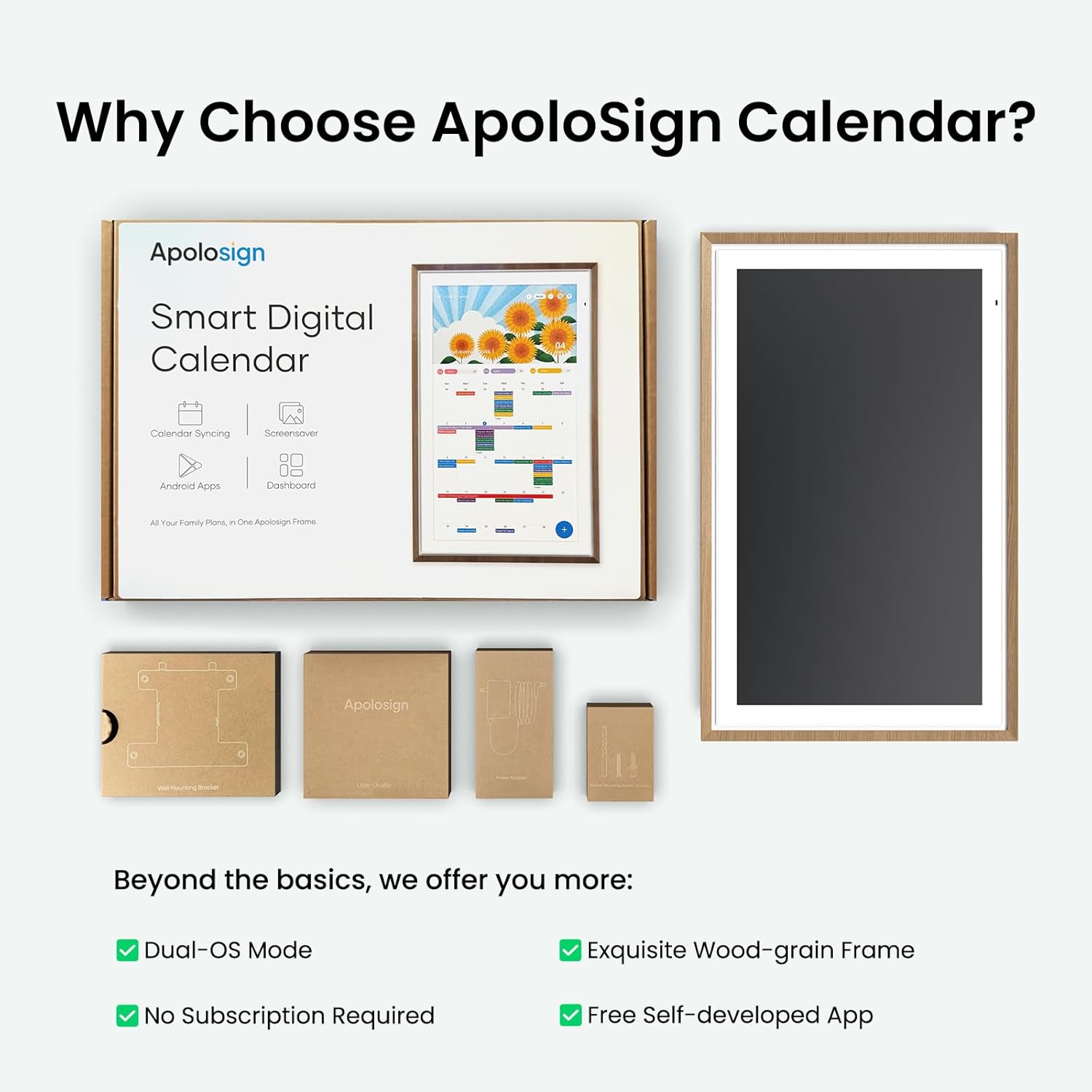 First Dual-Mode Digital Calendar — In Calendar Mode, apolosign calendar stay focused with Auto Sync Calendar across Google, Outlook, iCloud & more. Planner and Family Organizer keep schedules in one place. Switch to Android Mode to create a Dashboard and smart family hub