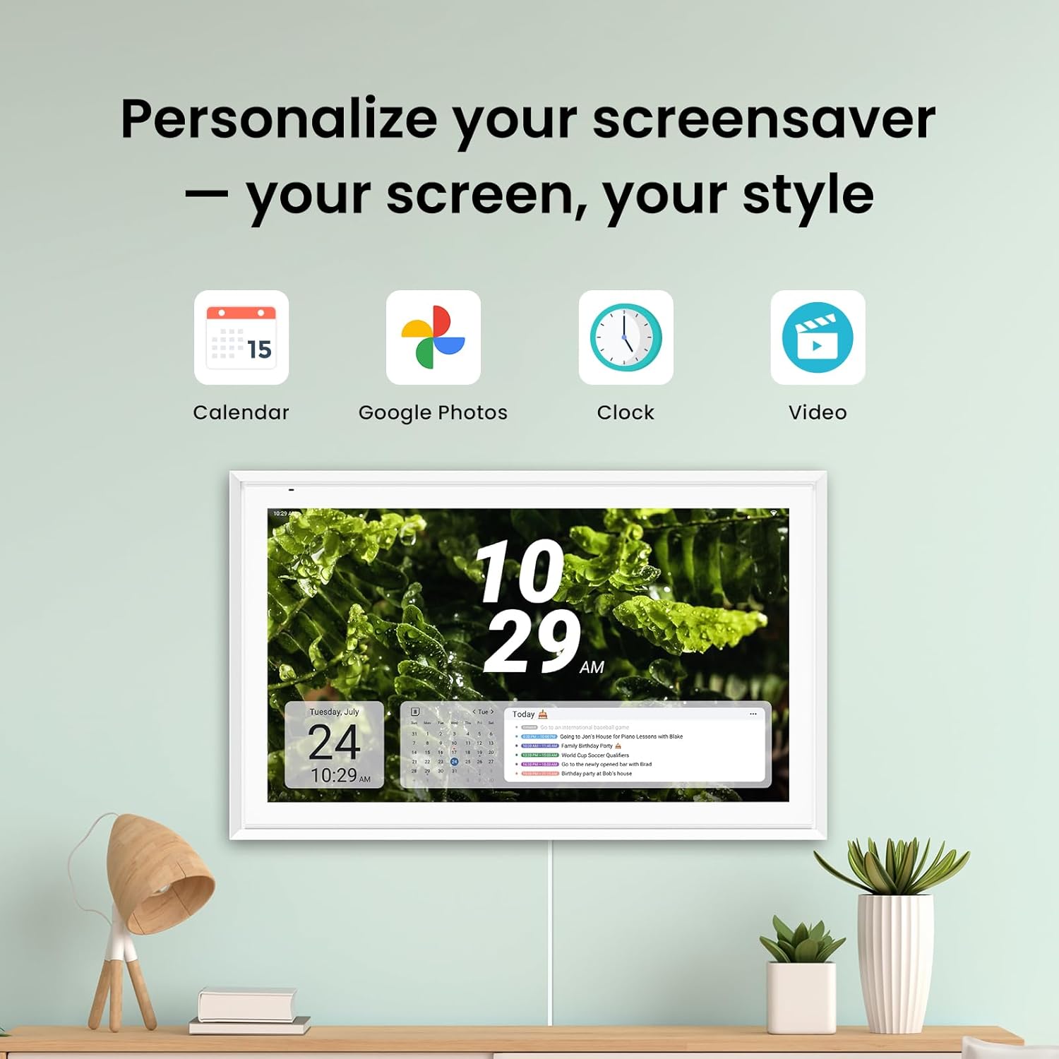 FULLY CUSTOMIZABLE DASHBOARD & WIDGETS Drag and drop your favorite widgets—meal planners, grocery lists, countdowns, chores, or weather—to build a screen that matches your family’s schedule. Download apps via Google Play for even more customization and keep everything organized at a glance.