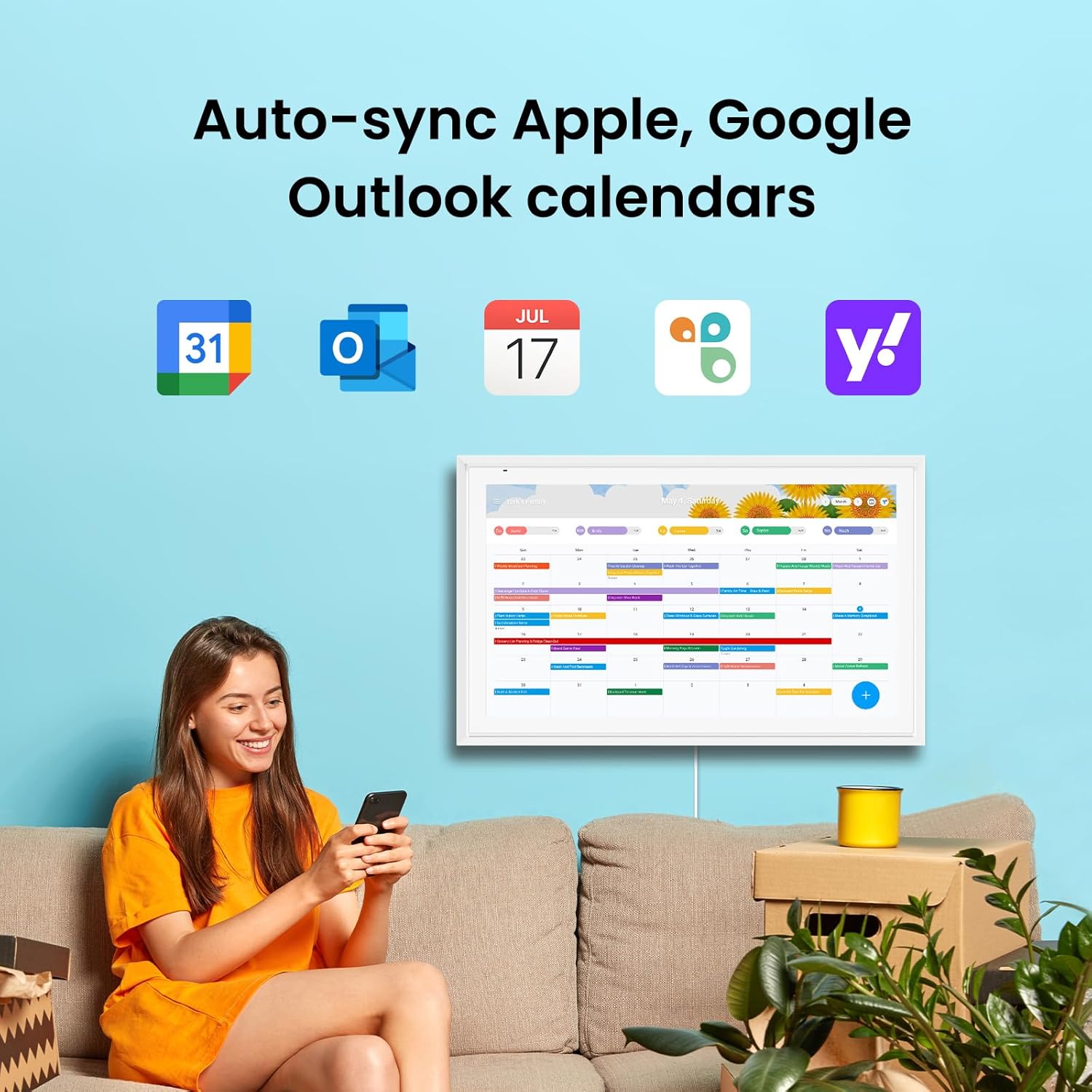 FAMILY SCHEDULE HUB – BUILT FOR EVERY ROOM Stay ahead of daily chaos with our large-screen digital smart calendar. Instantly syncs with Google, iCloud, Outlook, Yahoo, and more. Coordinate family activities, appointments, school runs, and shared reminders all from one easy-to-view dashboard.