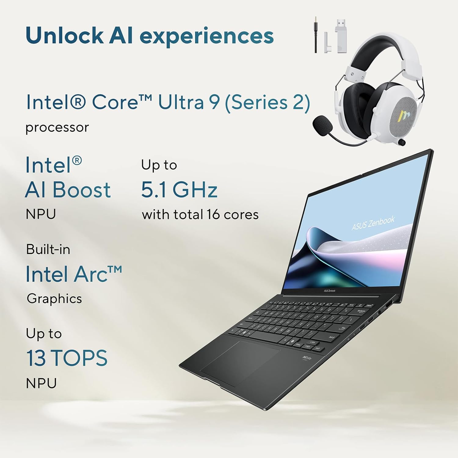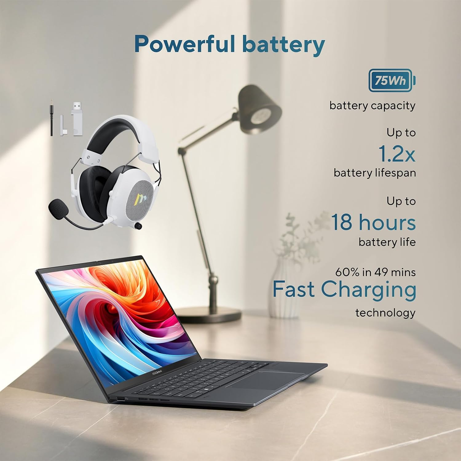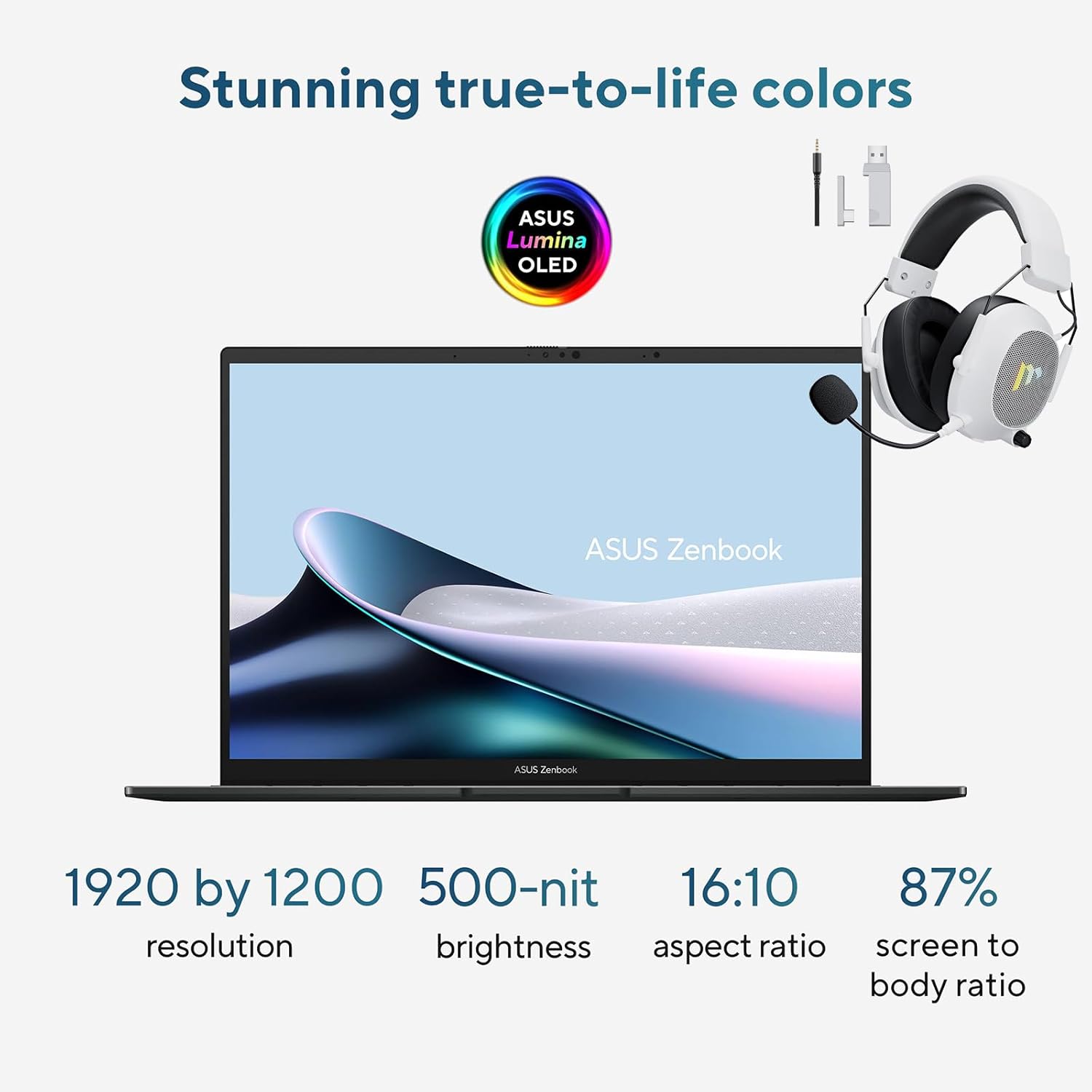 Stunning Visual Experience: Immerse yourself in a 14-inch WUXGA OLED touch display featuring breathtaking 1920×1200 resolution (16:10), 500-nit peak HDR brightness, 100% DCI-P3 color gamut for vivid visuals indoors or out, and a smooth 60Hz refresh rate. (What’s In The Box: ASUS Zenbook 14 OLED Laptop, 65W AC adapter, Mytrix 2.4GHz Wireless Headset)