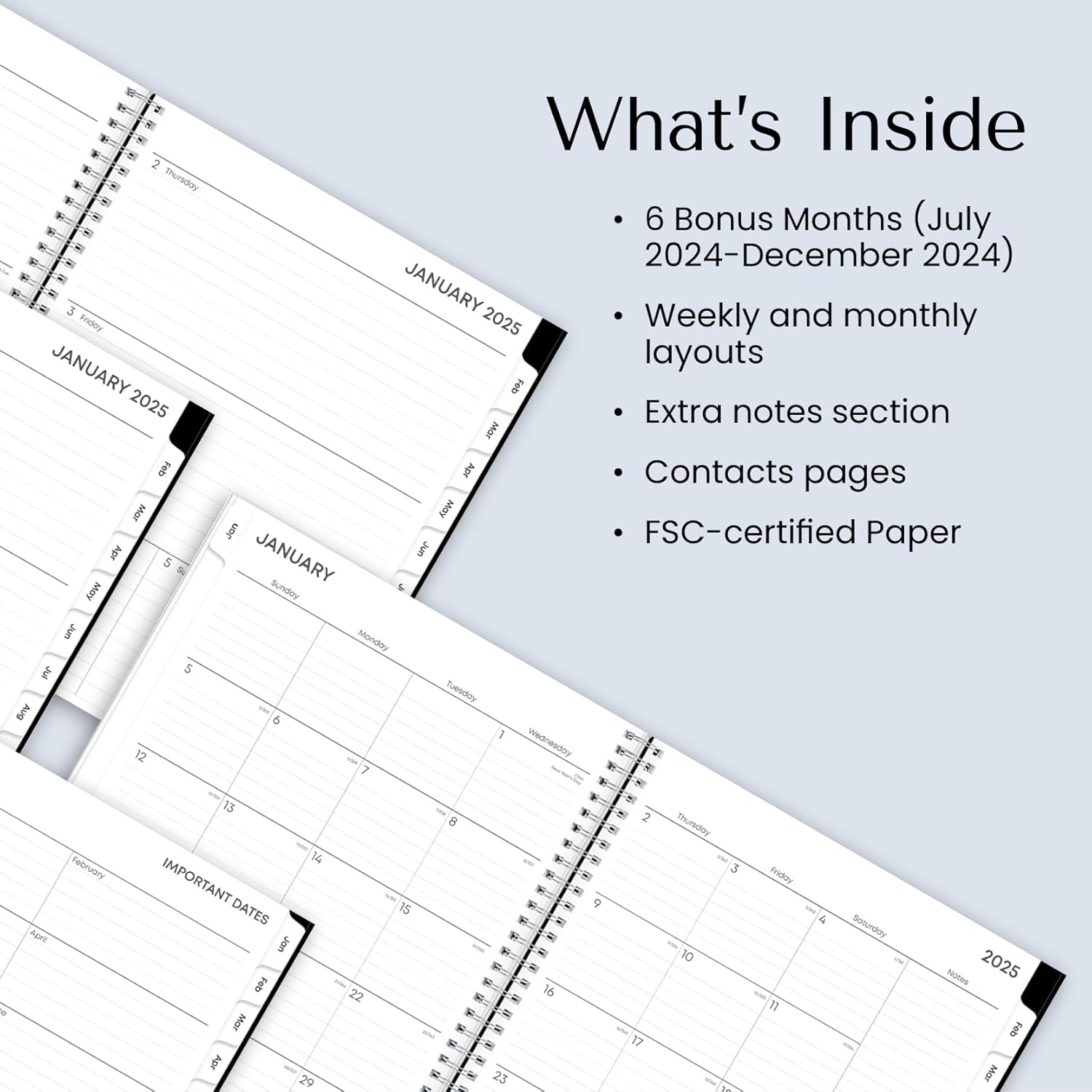 January 2025 – December 2025 pretty day planner with 12 months of monthly and weekly pages for easy year-round planning; 6 additional monthly pages (July 2024 – December 2024) are included