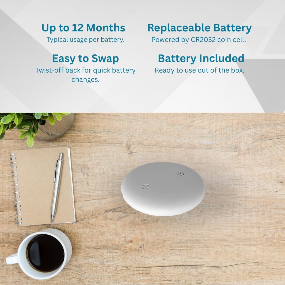 12-Month Replaceable Battery: Pre-installed CR2032 coin cell battery offers up to 1 year of use. Replace easily in seconds for long-term performance without recharging or replacing the device.
