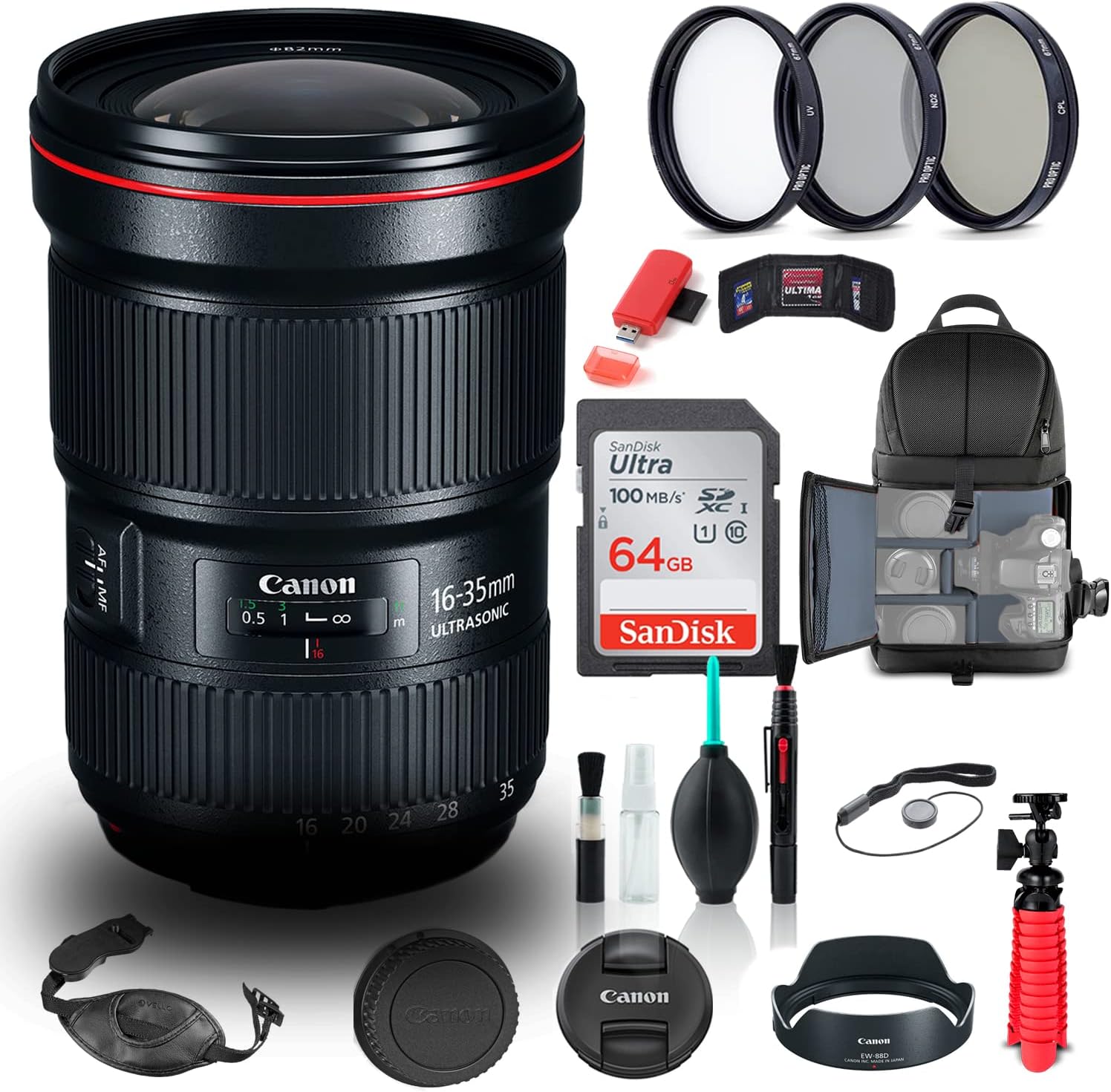 Bundle Items Includes: 1 x Canon EF 16-35mm f/2.8L III USM Lens, 1 x 82mm 3 Piece Filter Kit, 1 x Pro Sling Backpack, 1 x SanDisk 64GB Ultra SDXC Memory Card, 1 x Memory Card Reader, 1 x 12_inch Flexible Tripod, 1 x Memory Card Wallet, 1 x Lens Cap Keeper, 1 x Cleaning Kit, 1 x Hand Strap