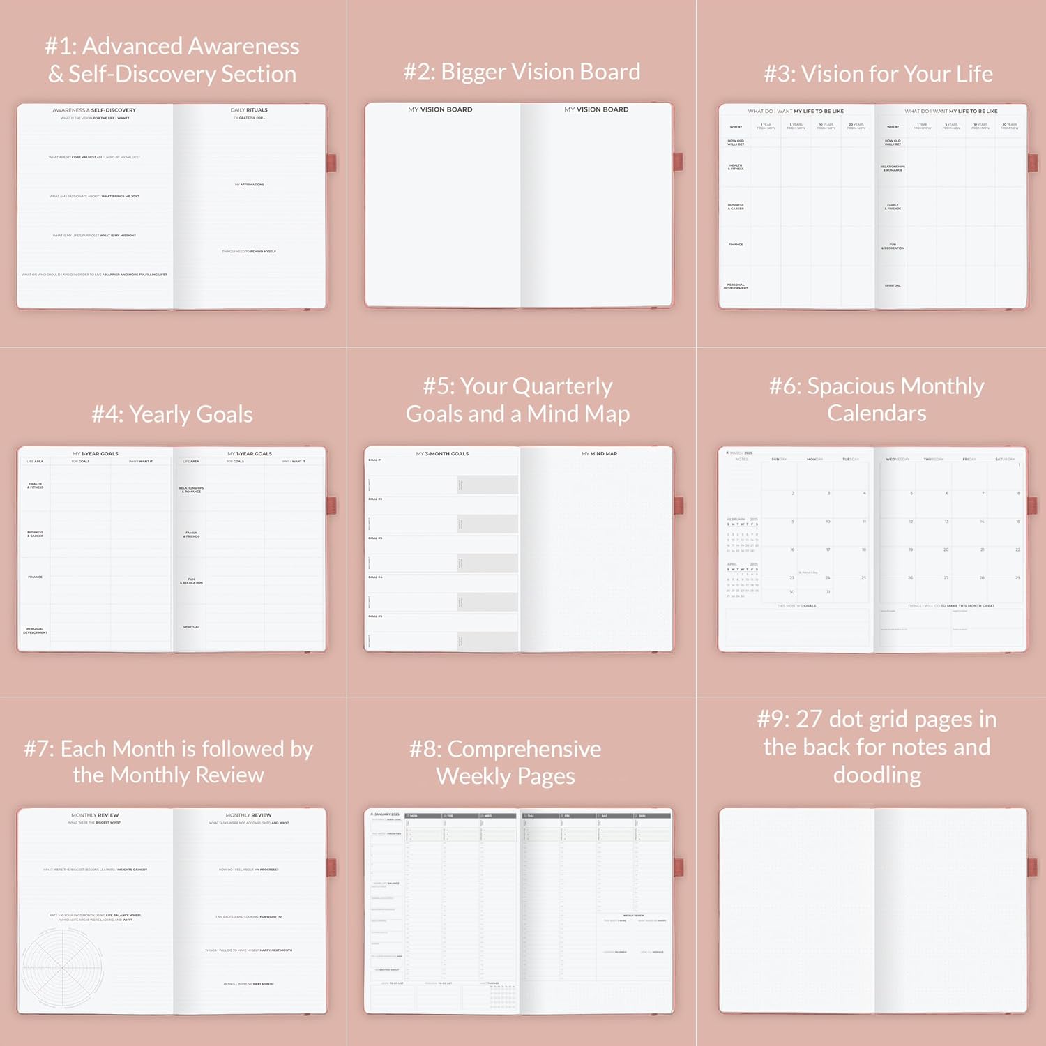 ✓ CREATE A VISION FOR YOUR FUTURE, SET GOALS & START PLANNING – This dated weekly planner 2025 will help you create a vision for your life, define your global goals, and incorporate them into your agenda.