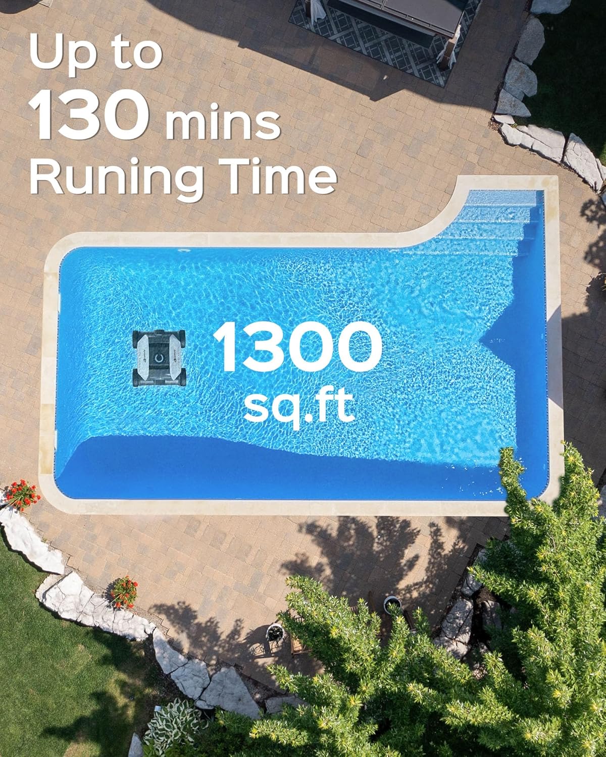 【Long Battery Life】Winny 300 Pro pool robot boasts a 6600mAh battery capacity for an epic cleaning ride lasting 120-130 minutes, that’s a 100% boost in cleaning area. Our pool cleaner is designed with multiple battery protections to ensure its safety and durability, making it a powerful pool vacuum for above ground pools.