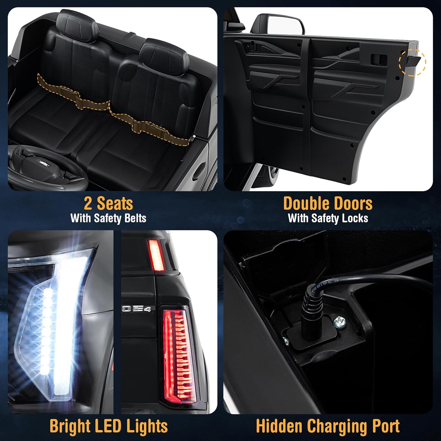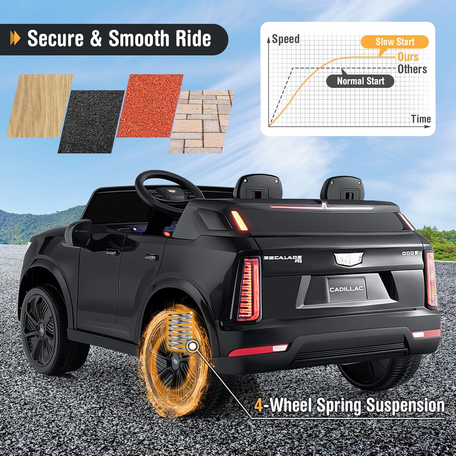 Excellent Performance: Powered by a 24V rechargeable battery and dual 65W motors, this electric car for kids boasts exceptional performance with adjustable speeds ranging from 1.9 to 3.7 mph. The ride on toy complies with ASTM and CPSIA, along with Cadillac official license to provide thrilling yet safe rides.