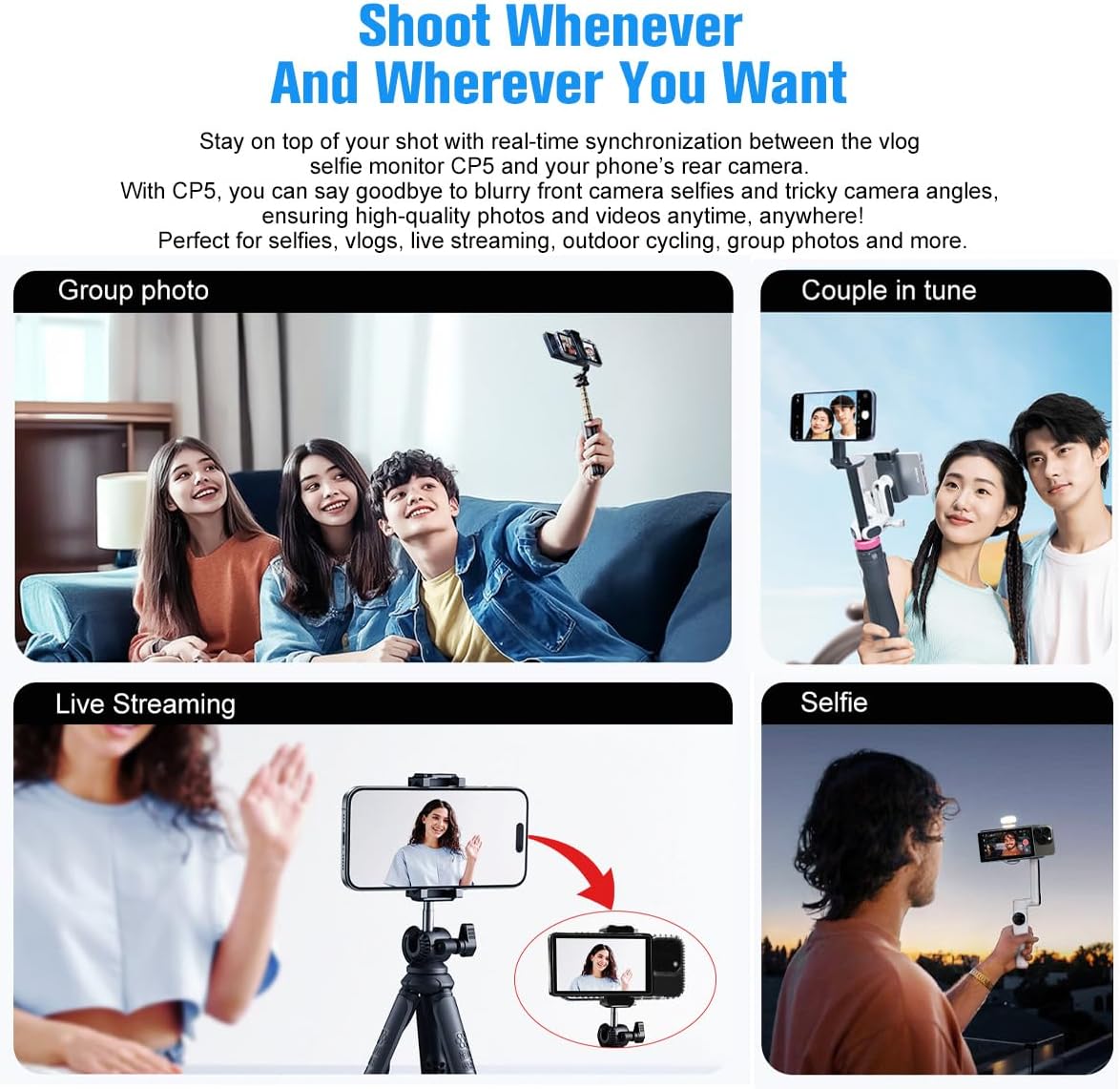 【Updated with Tiffany BlueR Magnetic Silicone Case】Stay on top of your shot with real-time synchronization between the vlog selfie monitor CP5 and your phone’s rear camera.With Shimbol CP5, you can say goodbye to blurry front camera selfies and tricky camera angles, ensuring high-quality photos and videos anytime, anywhere!Perfect for selfies, vlogs, live streaming, outdoor cycling, group photos and more.