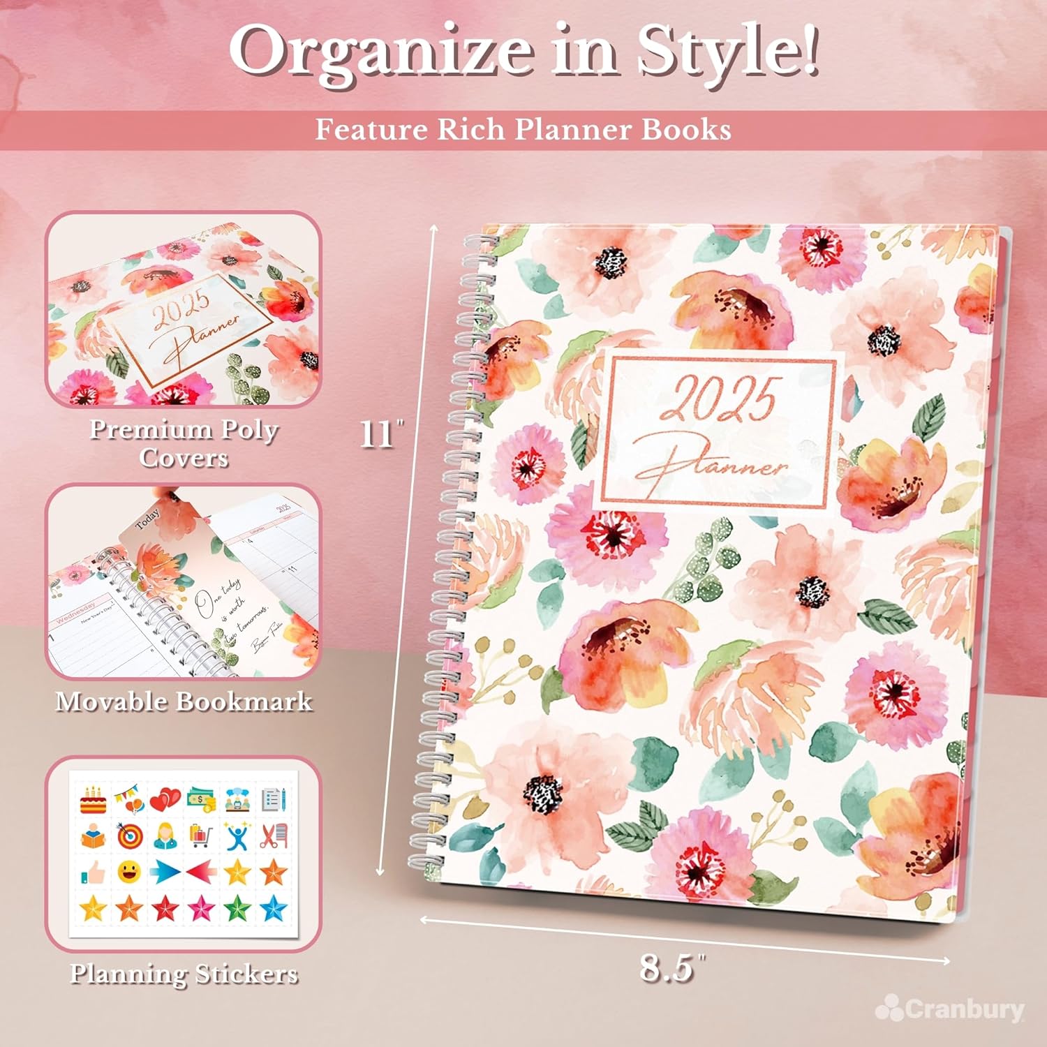 Full Year 2025 Planner Book, 8.5×11″, Use Jan 2025 to Dec 2025. Bright watercolor design monthly planner, Weekly planner 2025. Extras include laminated bookmark, Stickers.