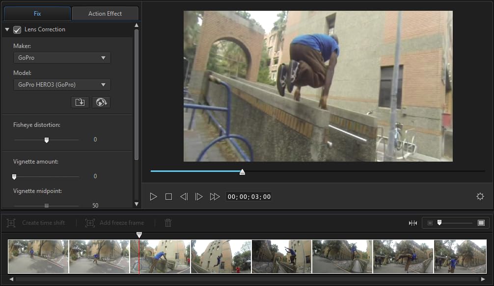 Lens Correction : Applying lens correction for fish-eye distortion is incredibly easy. Choose the action camera used to shoot the video footage and lens corrections are applied automatically.