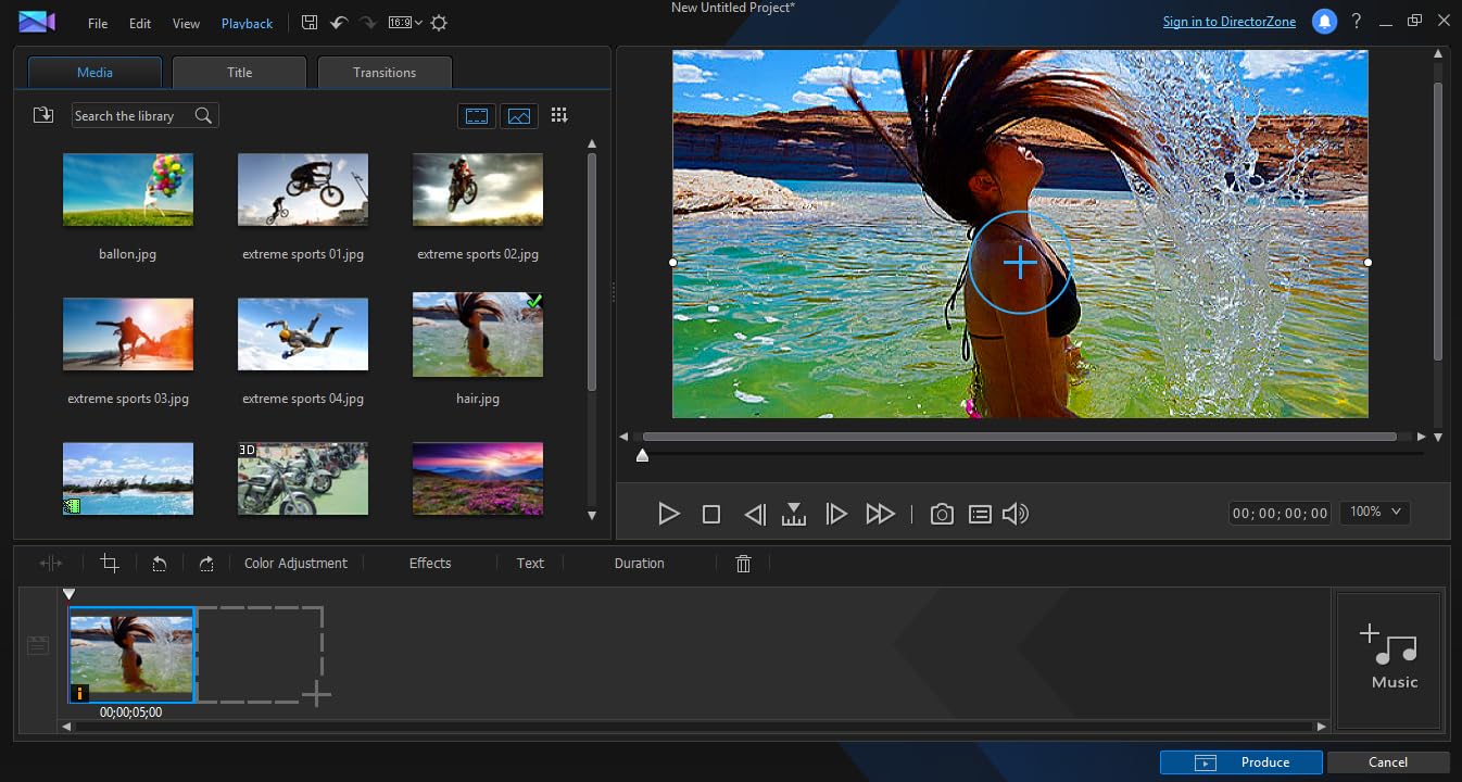 ActionDirector’s “Theme” module lets you create impressive, professional looking movies almost instantly by simply choosing from a broad range of ready-made action templates then dragging and dropping videos and photos into the positions indicated. The results are stunning and ready to share instantly.