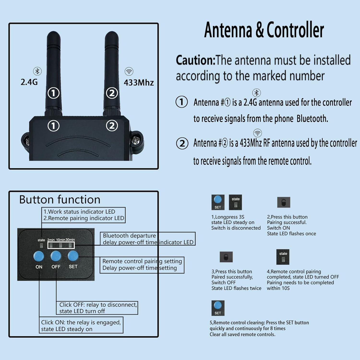 【Unique Design】: This wireless remote control switch uses two antennas, which can receive 433Mhz RF signals and 2.4G Bluetooth signals, you can independently use the remote control or cell phone Bluetooth to control your device, release your hands.