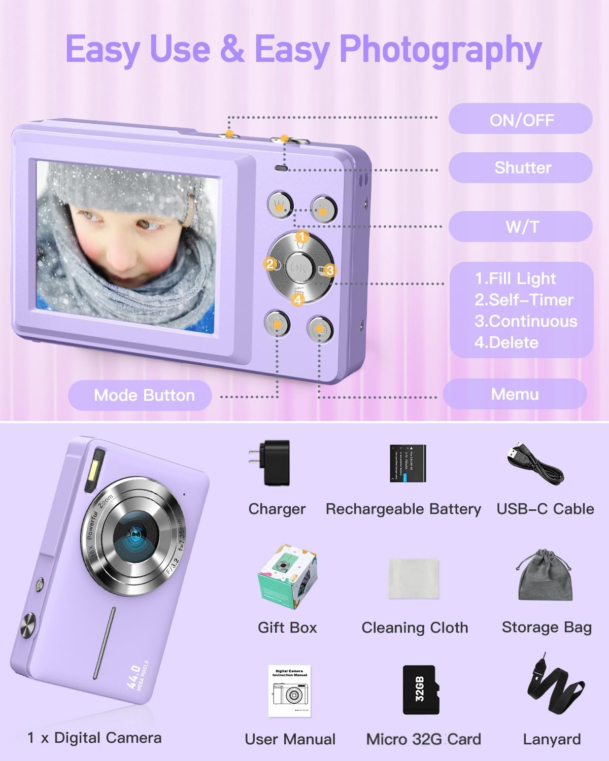【Image Transfer & 32GB Card】Effortlessly transfer your images from the digital camera to your computer or smartphone. This cameras for pictures comes with a 32GB card, ensuring ample storage for preserving precious memories. Use the provided USB-C cable to swiftly download pictures and videos to your computer. Alternatively, you can utilize an card reader (not included) to transfer pictures and videos from the camera’s card to your phone for convenient sharing on social media