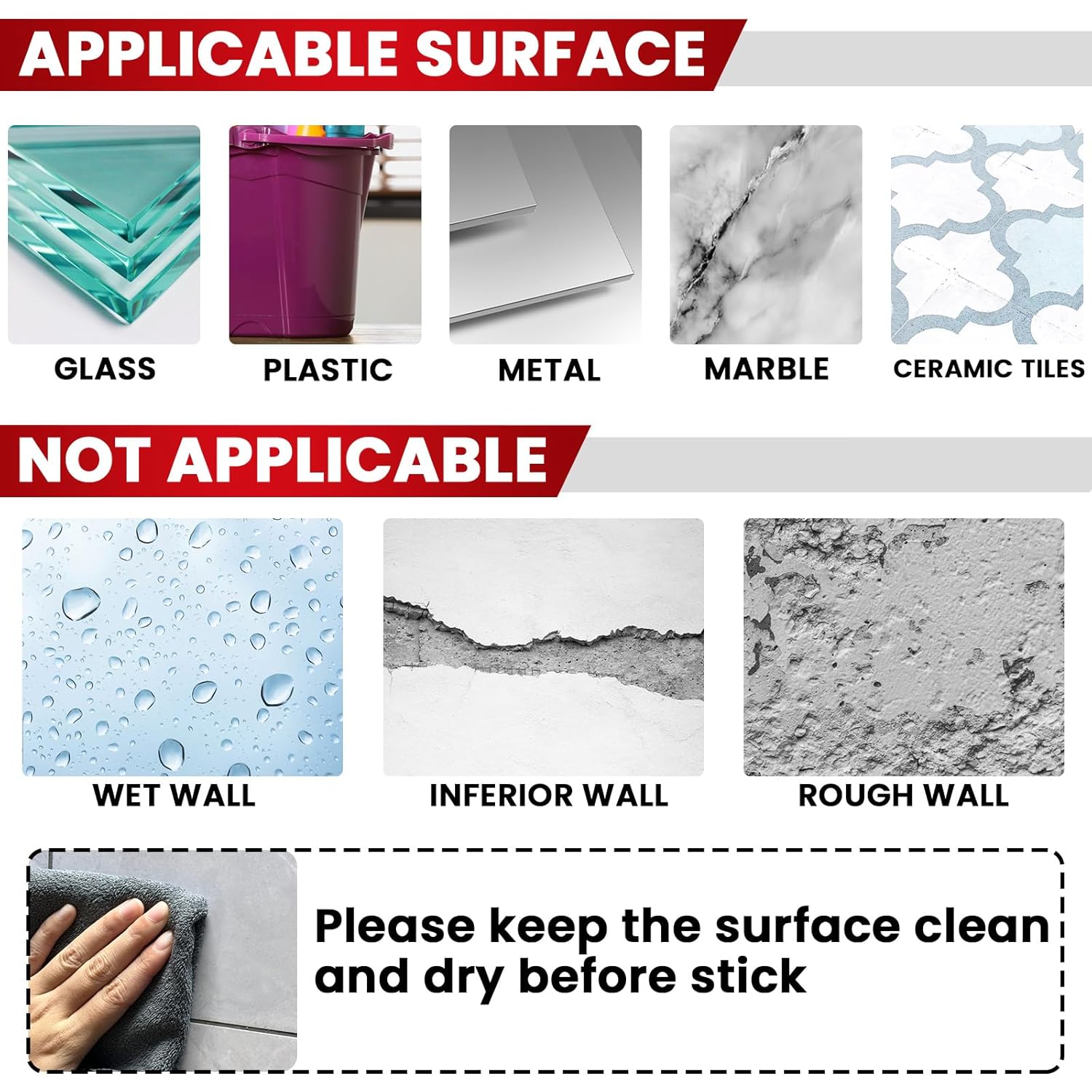 Firmly adheres to various smooth surfaces: Such as glass, plastic, metal, marble, ceramic tiles; Please keep the surface clean and dry before stick; But should be noted that removing it may damage your painted wall; Waterproof after installation