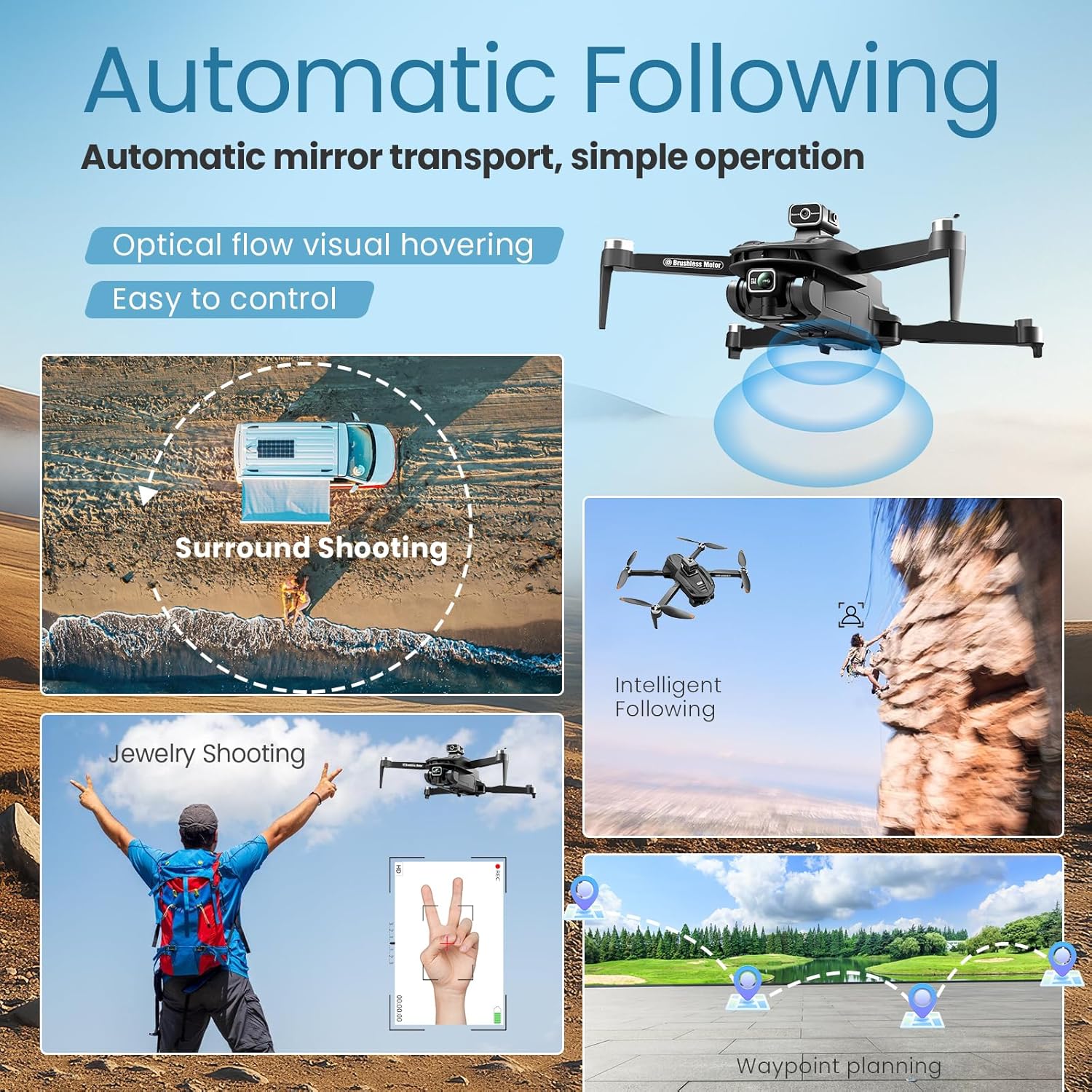 Intelligent GPS Flight System with Triple Safety. 4-way obstacle avoidance (front/back/left/right) and auto-return (low battery/signal loss).The drone is equipped with 4 high-efficiency and energy-saving brushless motors, with high explosive power, low power consumption, quieter flight, stronger power, more stable flight, and suitable for a variety of venues.