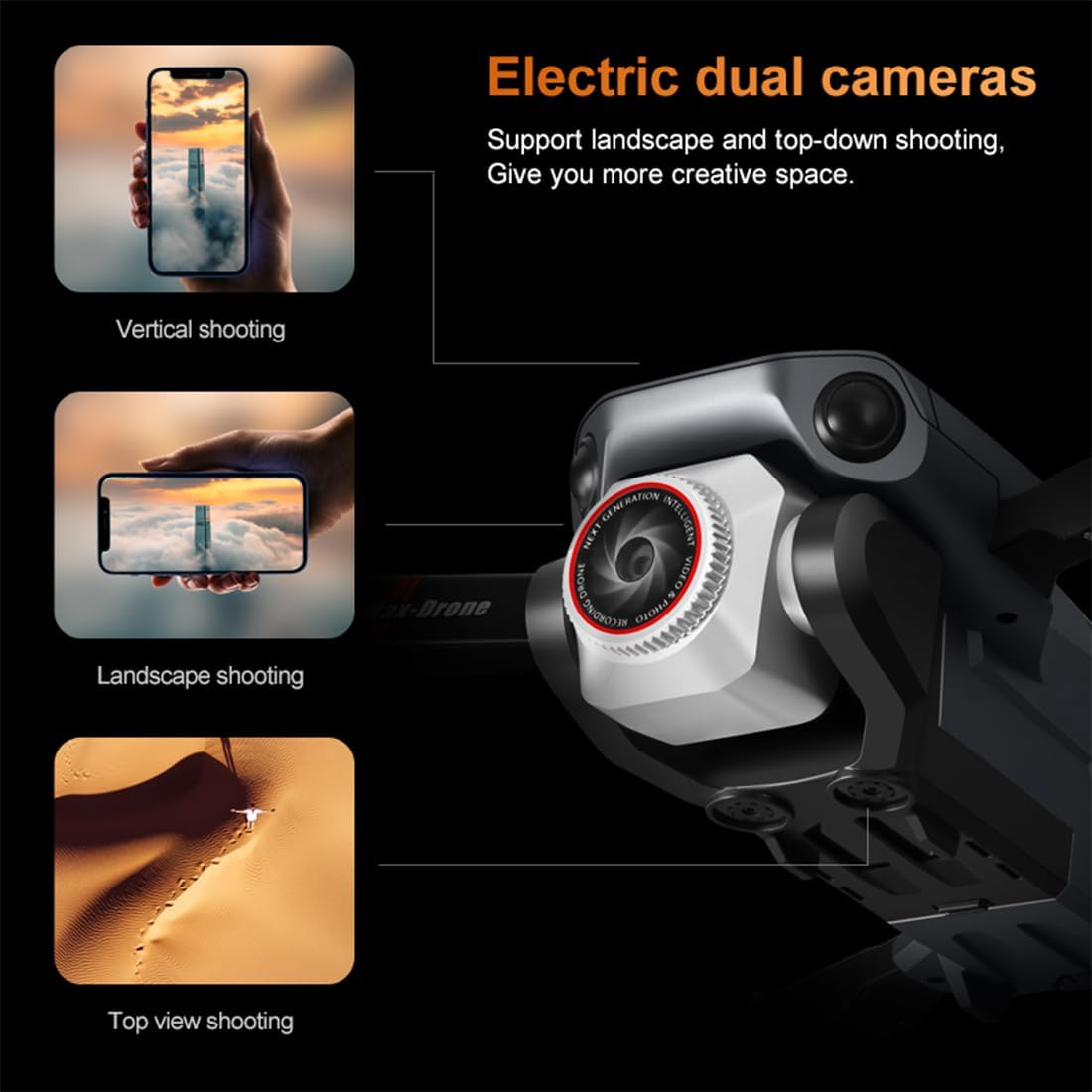 【Ultra-wide Angle Dual 4K HD Camera】This drone is equipped with a high-definition 4+1K camera, capturing stunning photos and videos with high quality and frame rates. The 135° wide-angle lens and 90° adjustable provide a broader and clearer field of view.Drone supports WIFI FPV transmission for smooth HD live-streaming, capturing unforgettable moments in the sky and providing you with a more exciting flying experience of drone.