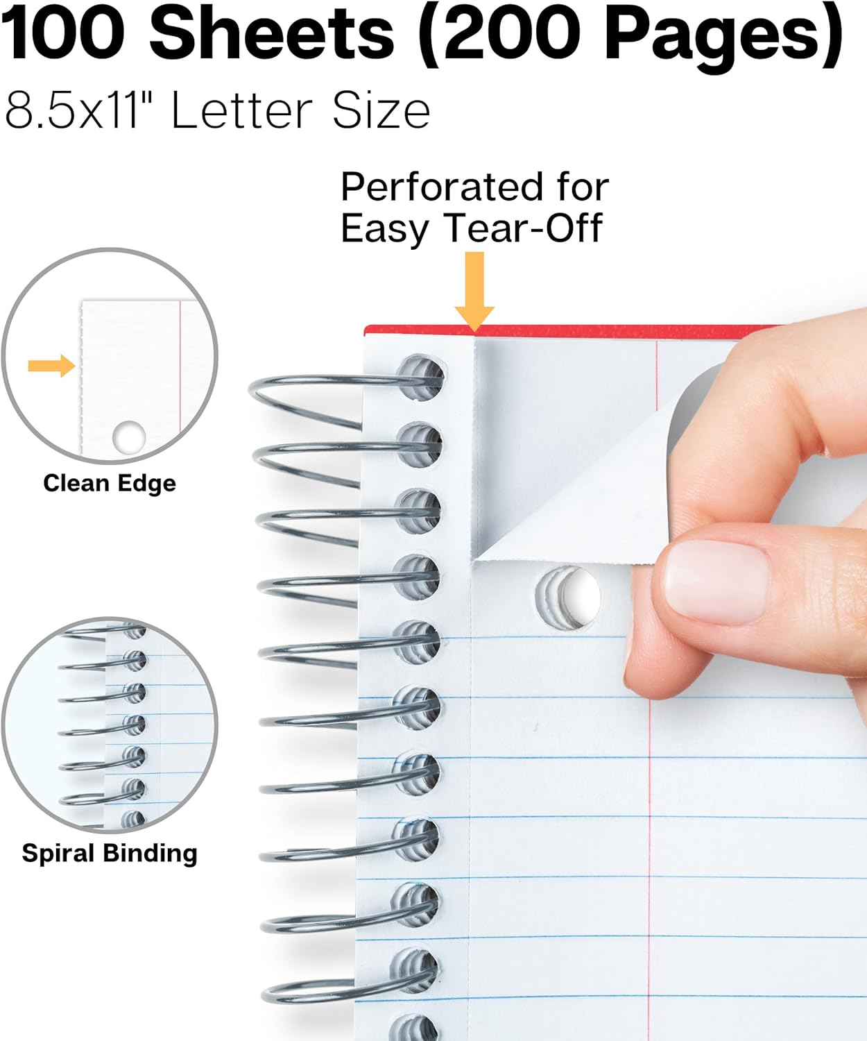 100 Sheets (200 Pages) College Ruled Paper: Standard 9/32” width, Take more notes per page. 3-Hole punched, Perforated for easy tear off. Detached paper size: 8-1/2” x 11”.