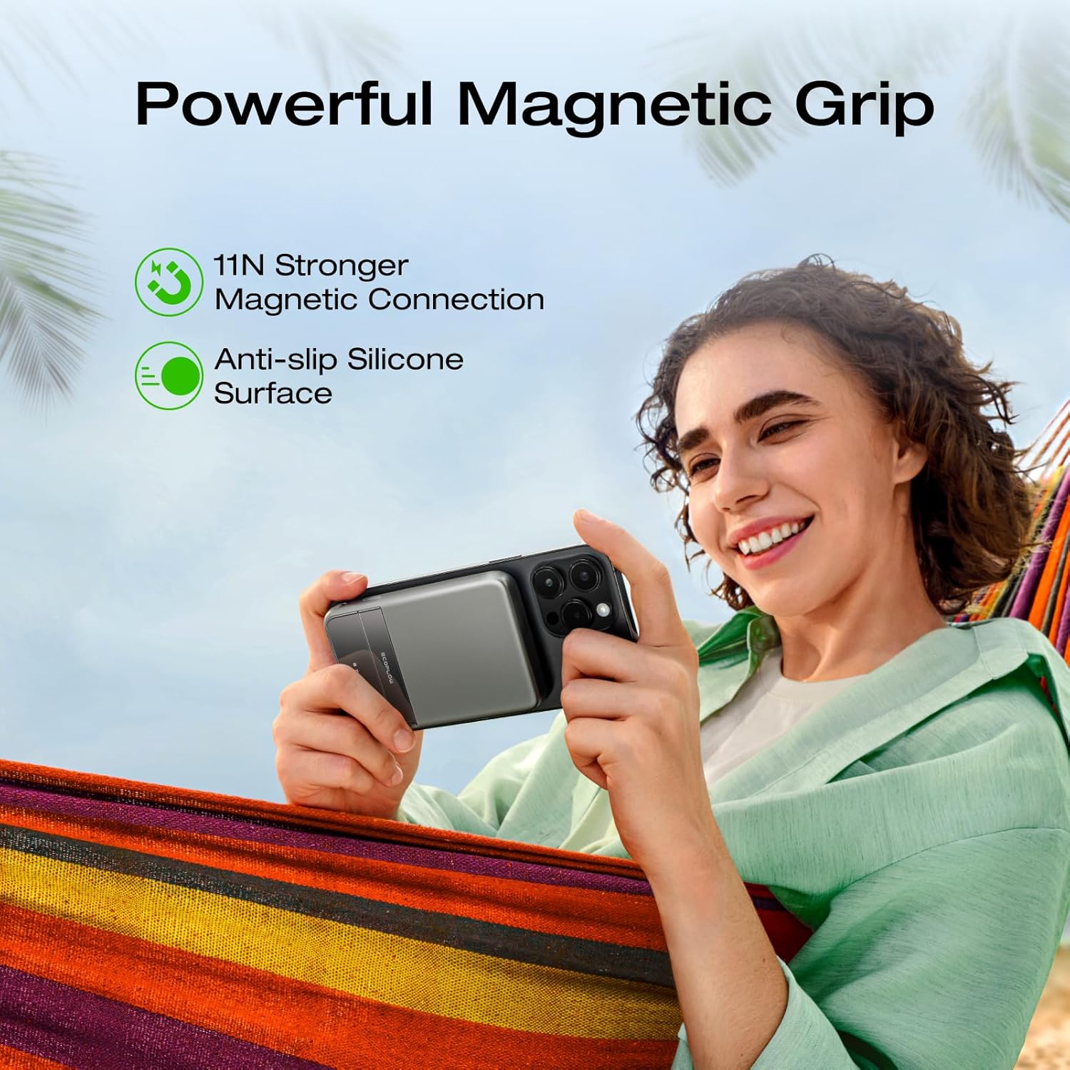 The recharge time is another standout feature; it charges back up very quickly thanks to the included 20W GaN USB-C charger. I also appreciate the built-in cables and the magnetic stand, which make it even more convenient and eliminate the need for extra accessories. The wireless charging feature is reliable, and being Qi2 certified gives me extra confidence in both the speed and safety of the wireless charging.
